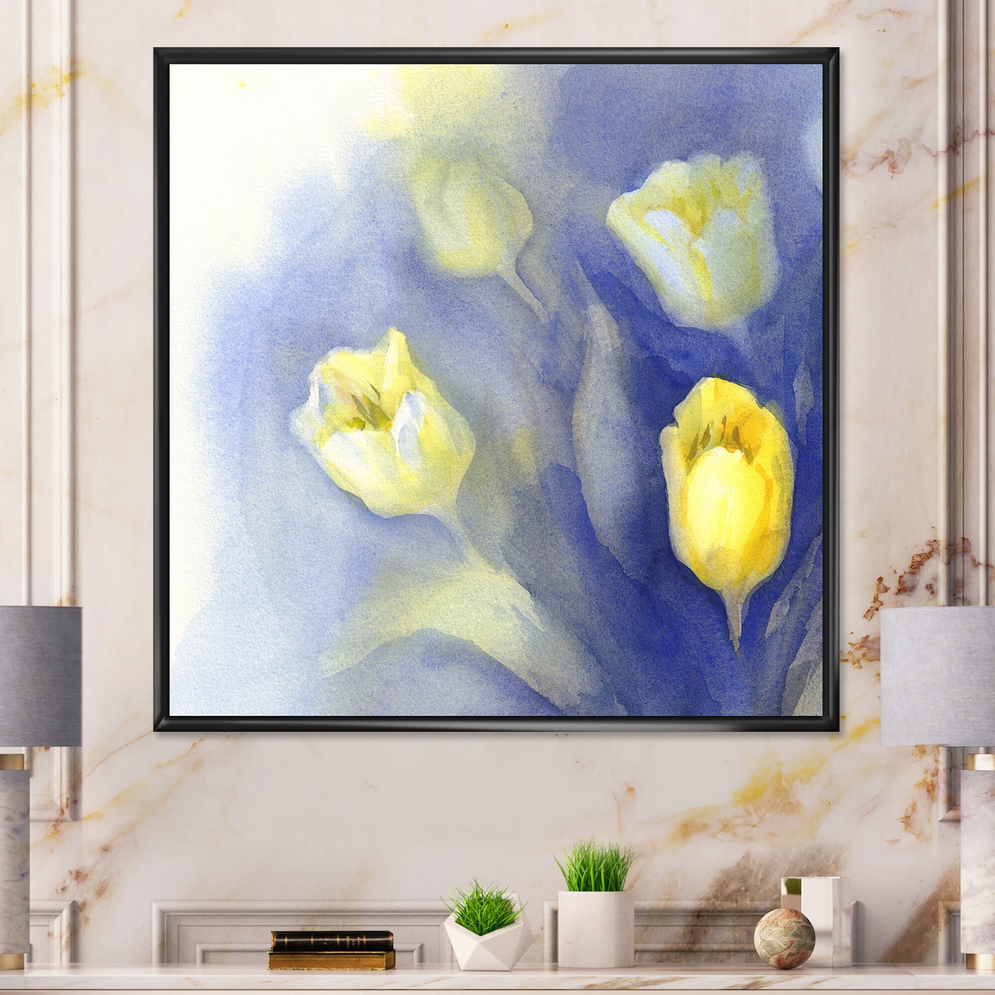 Designart "Yellow Tulips on Blue" Traditional Framed Canvas Wall Art