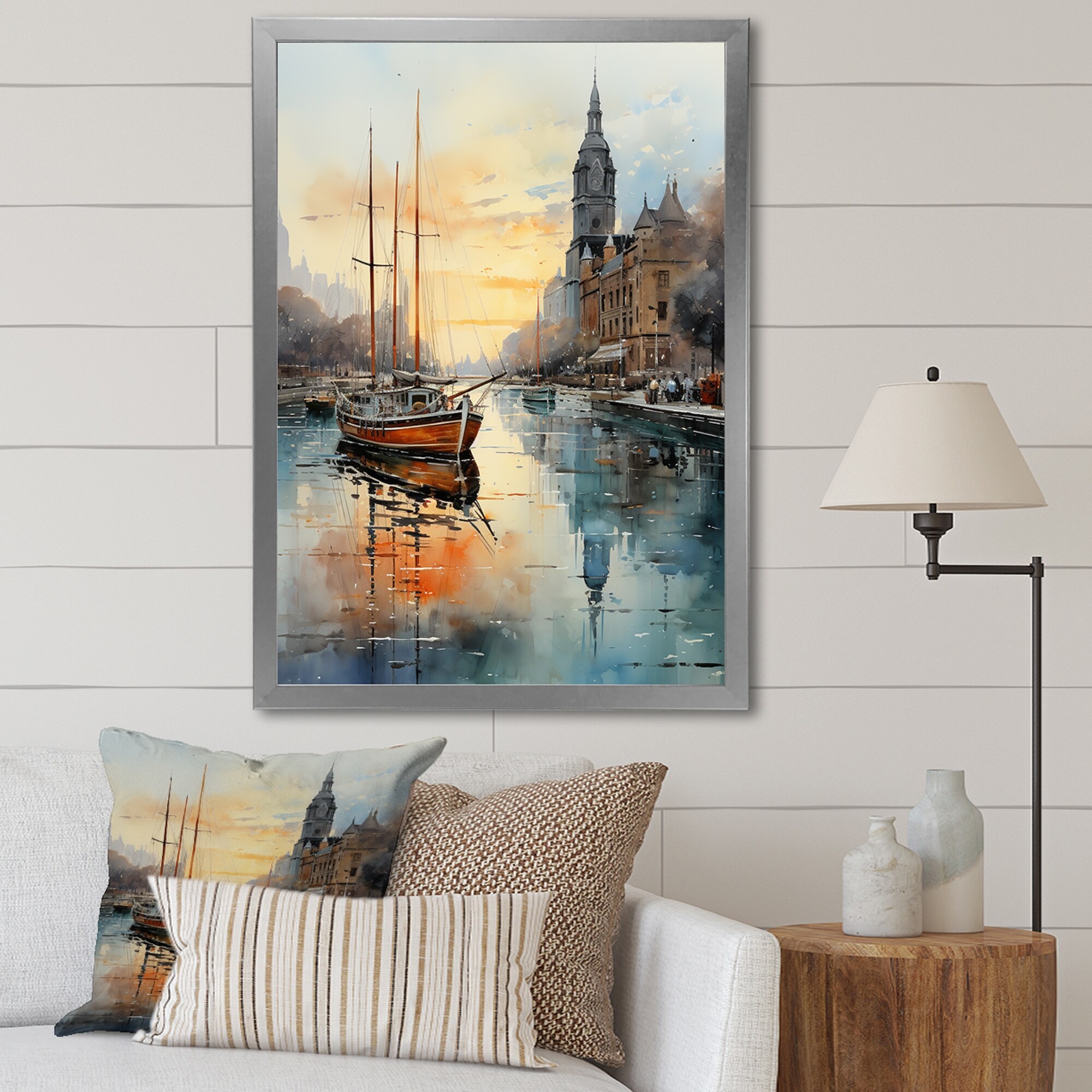 Designart "Yellow Teal New York Harbor Twilight" City New York Framed Canvas Print