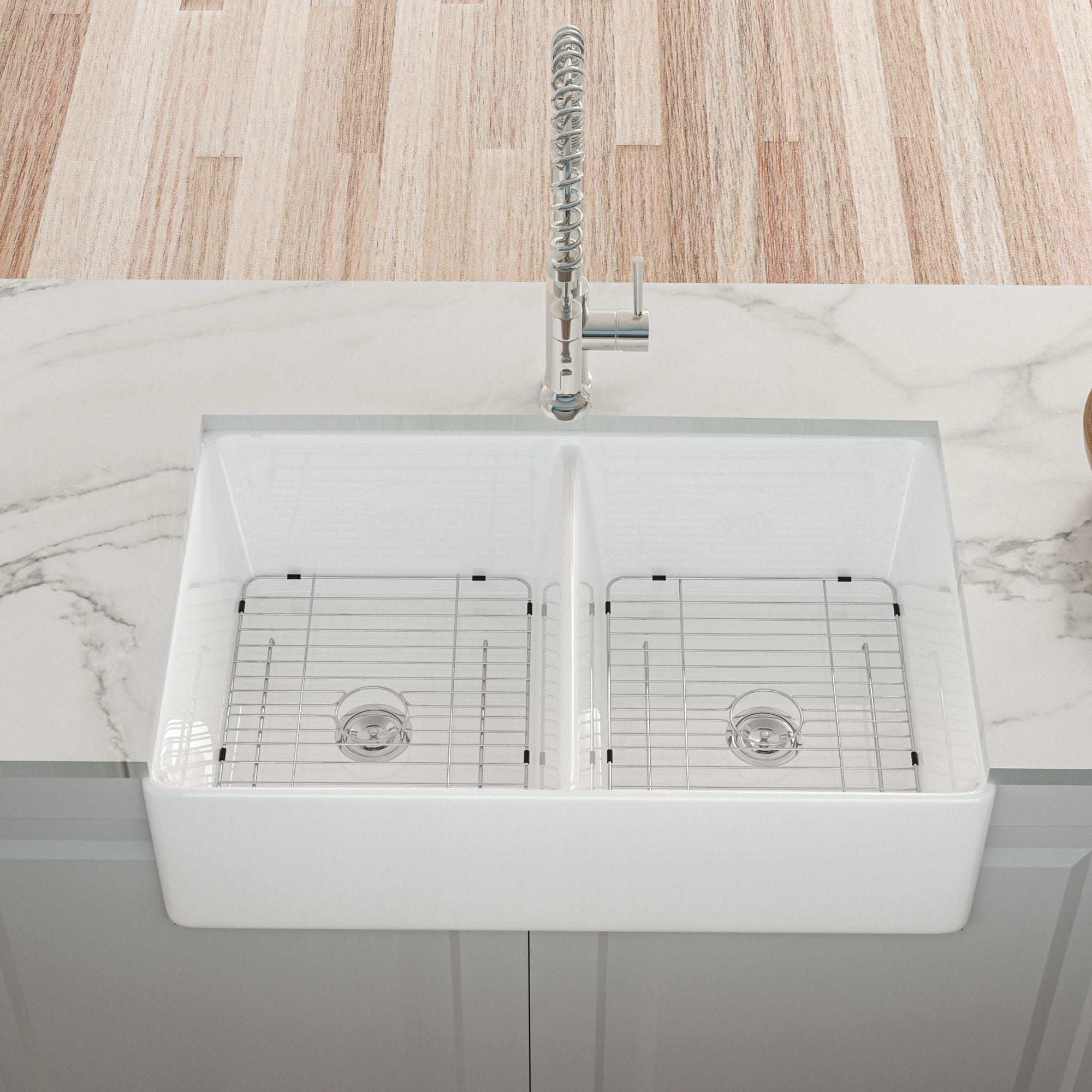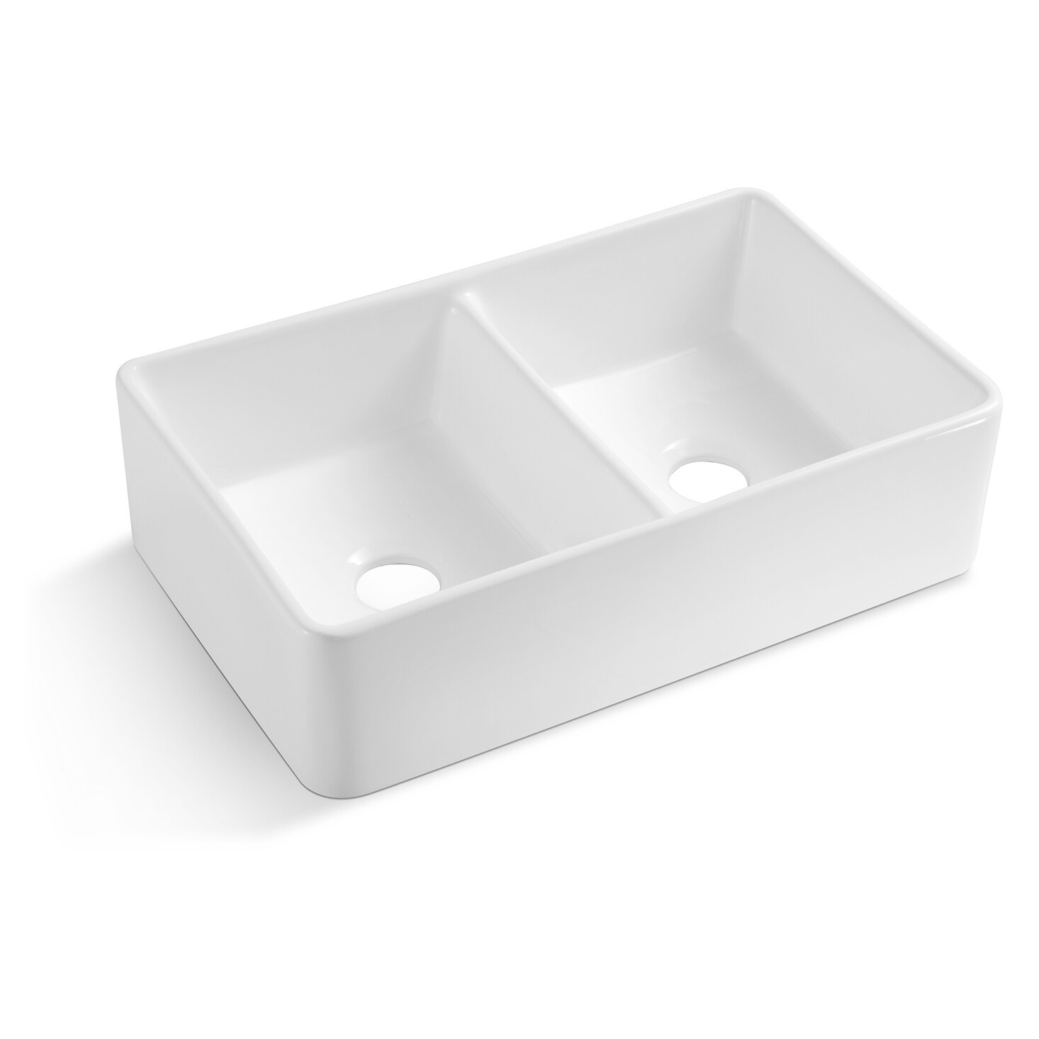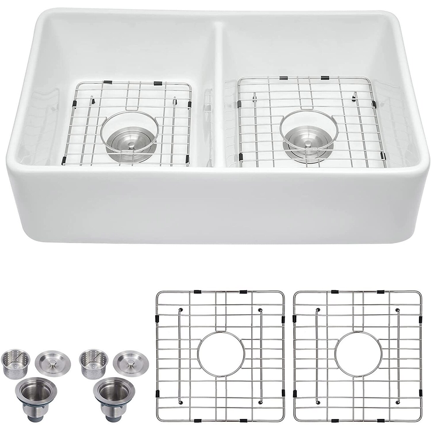 32" L x 20" W Double Basin Farmhouse Kitchen Sink with Basket Strainer