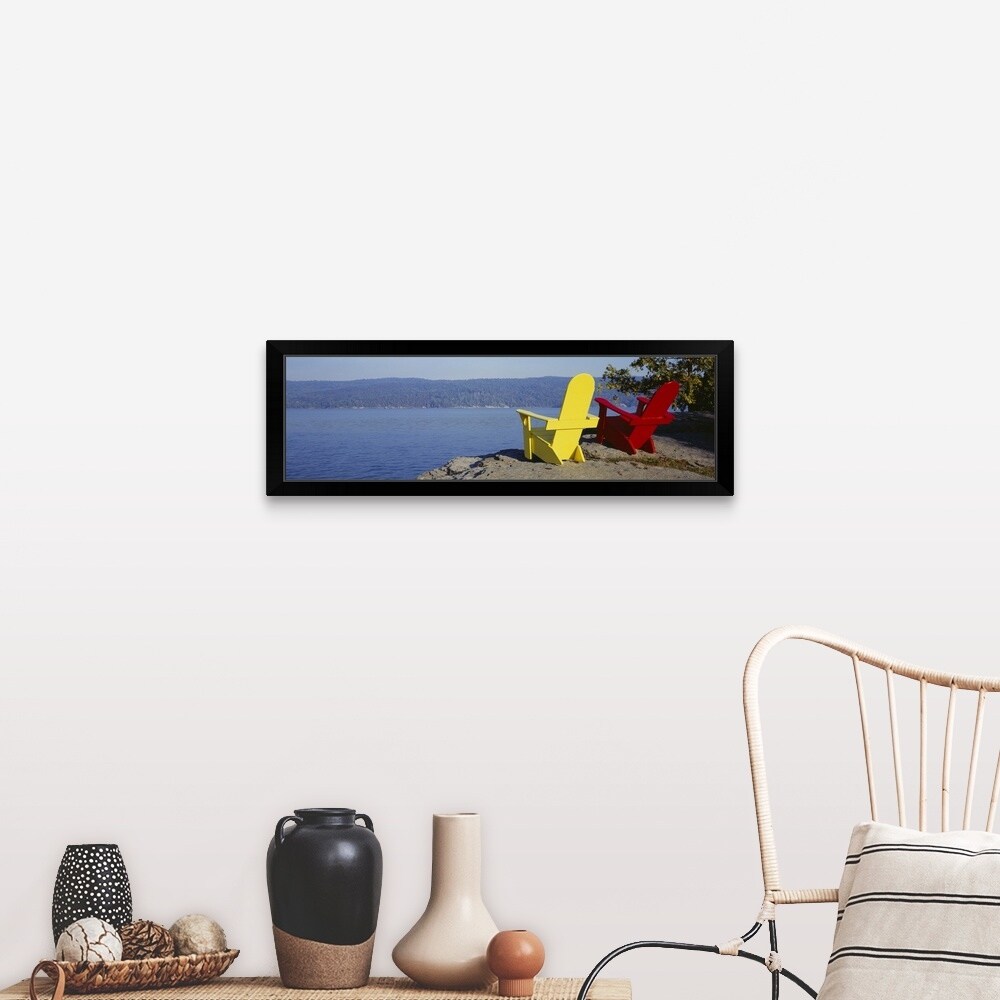 "Red and Yellow Adirondack Chairs Near A Lake, Champlain Lake, Vermont" Black Framed Print