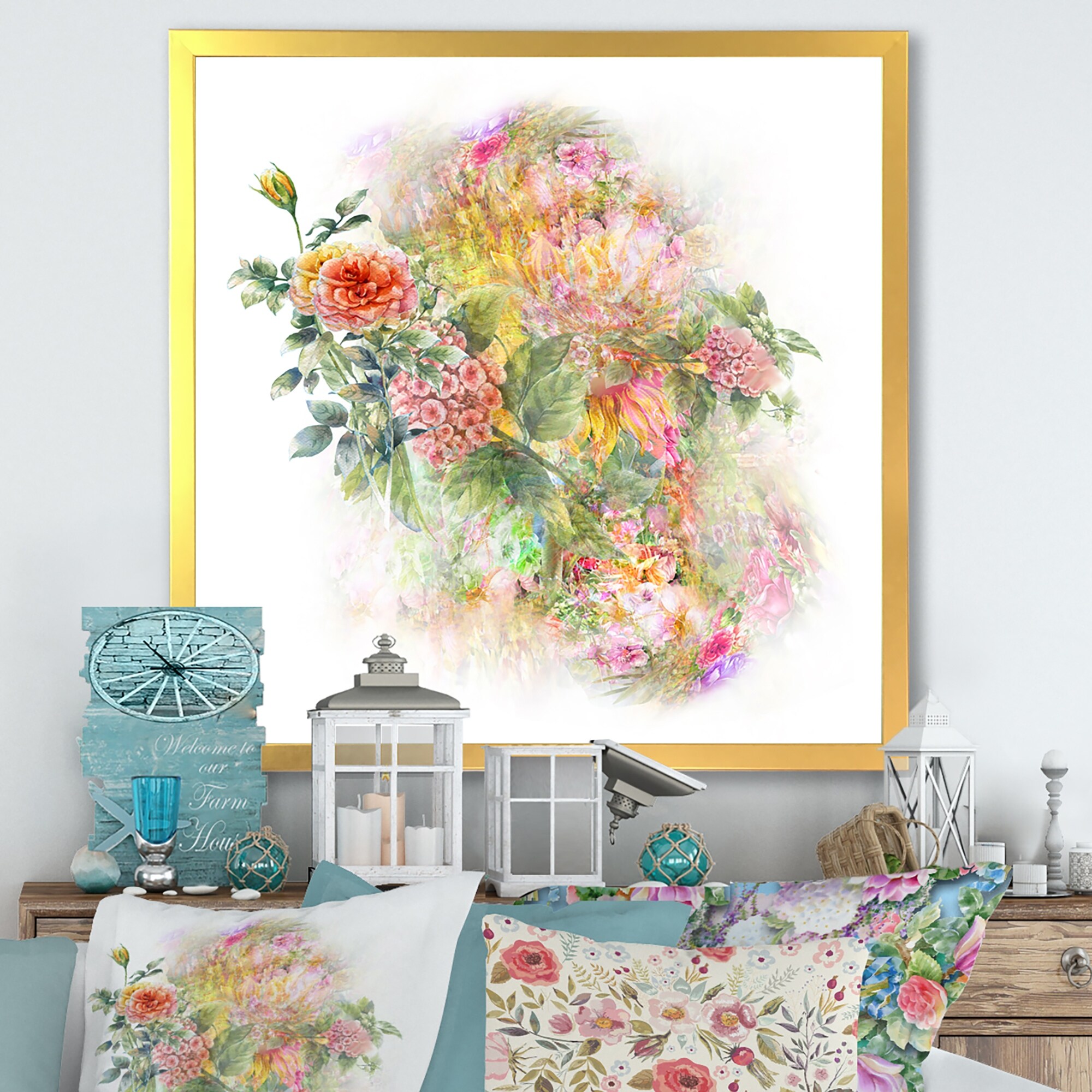 Designart "Grunge Pink Green Summer Flowers VII" Farmhouse Framed Wall Art