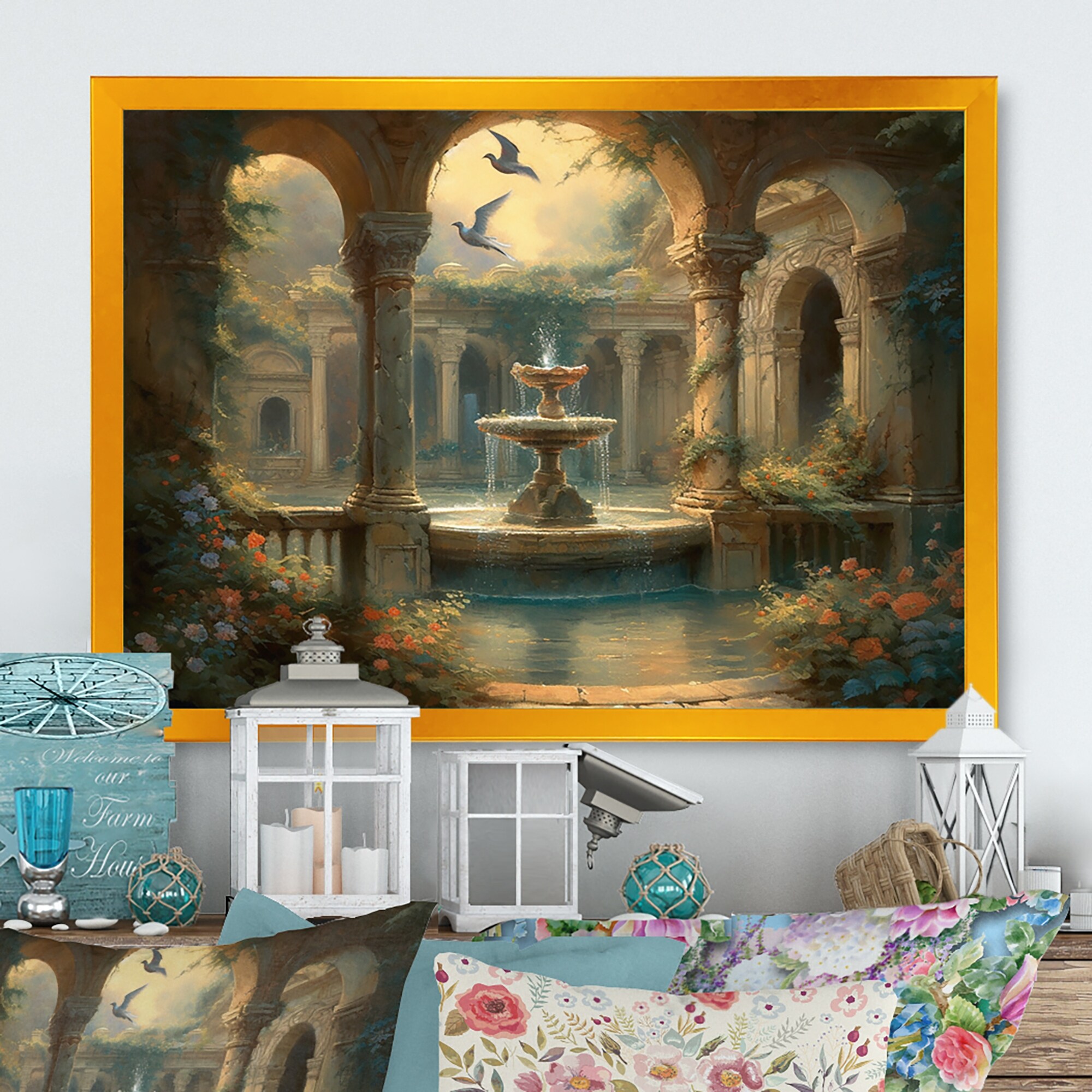 Designart "Floral Fountain And Birds Vii" Floral Framed Canvas Prints