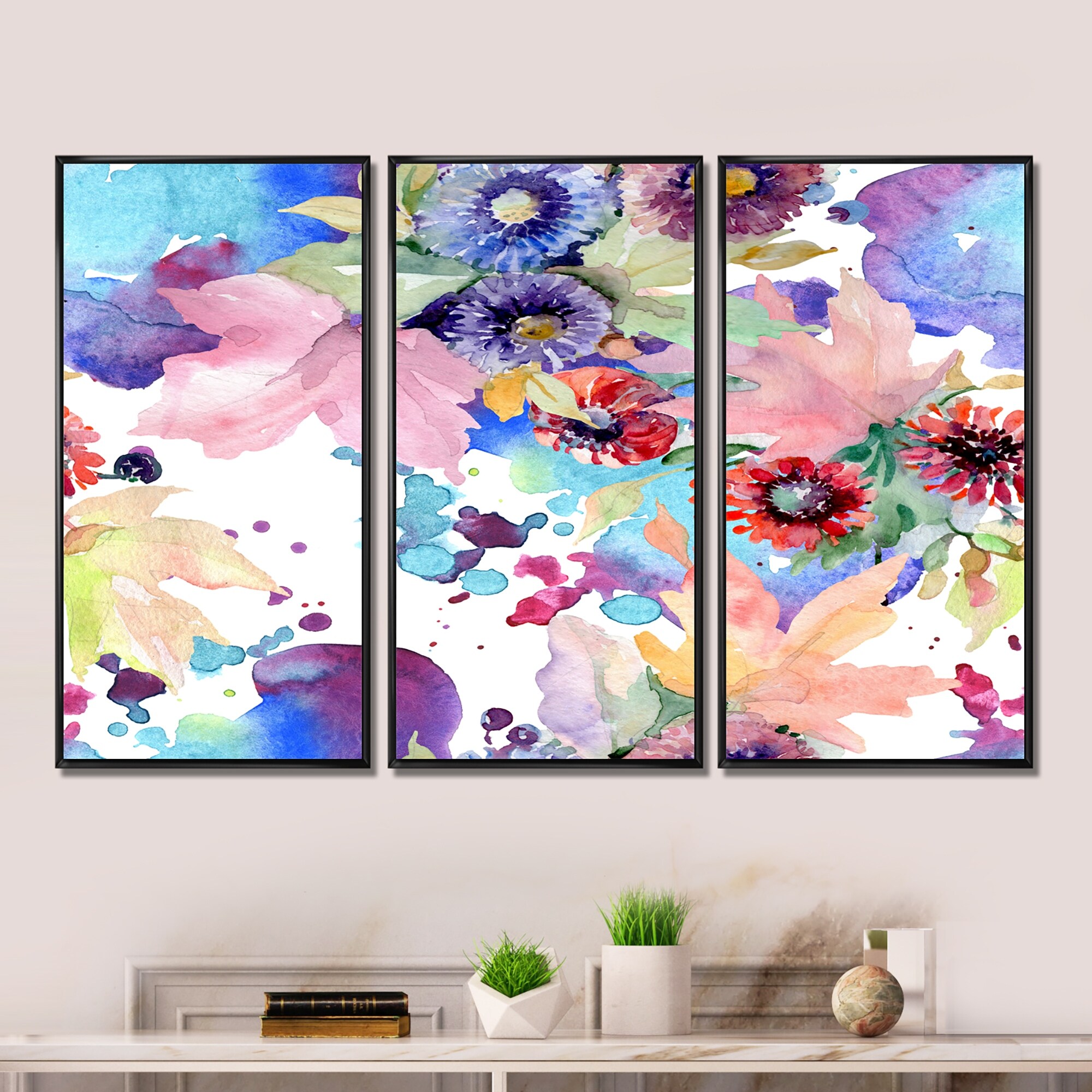Designart "Vibrant Wild Spring Leaves and Wildflowers VIII" Modern Framed Wall Art Set of 3 - 4 Colors of Frames