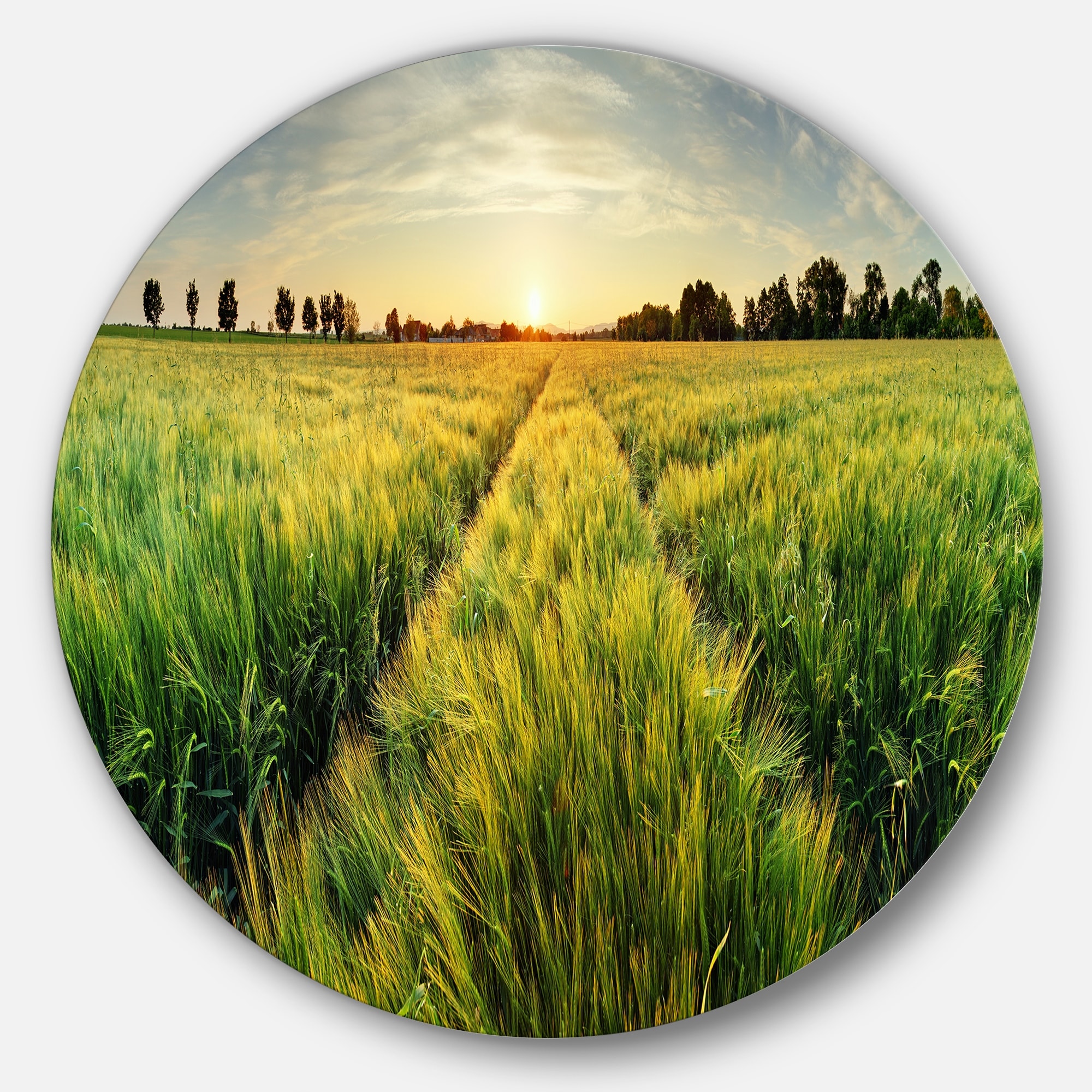 Designart 'Green Wheat Field at Sunset' Landscape Photo Disc Metal Artwork