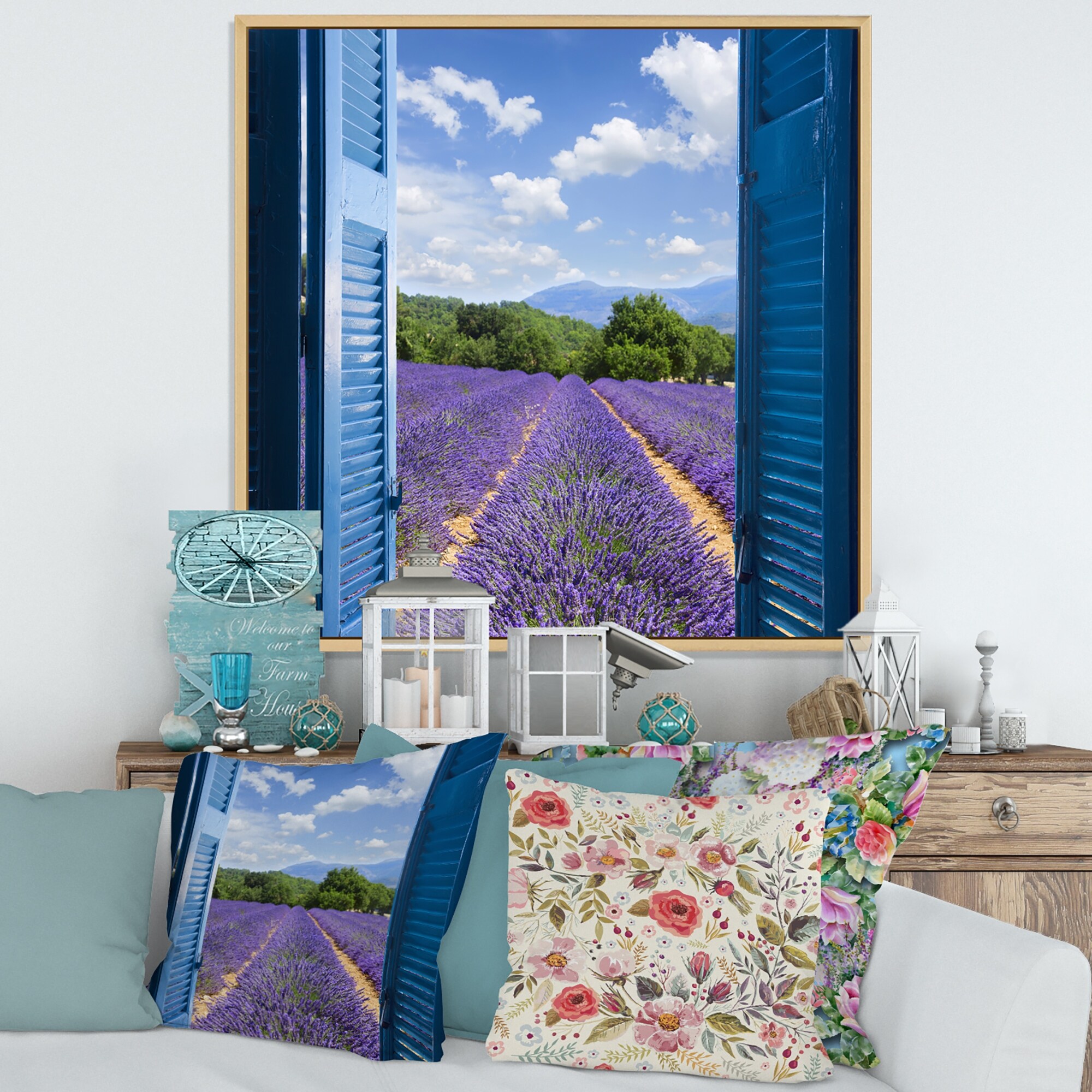 Designart "Lavender Field Through Blue Open Cottage Window" Farmhouse Framed Canvas Wall Art Print