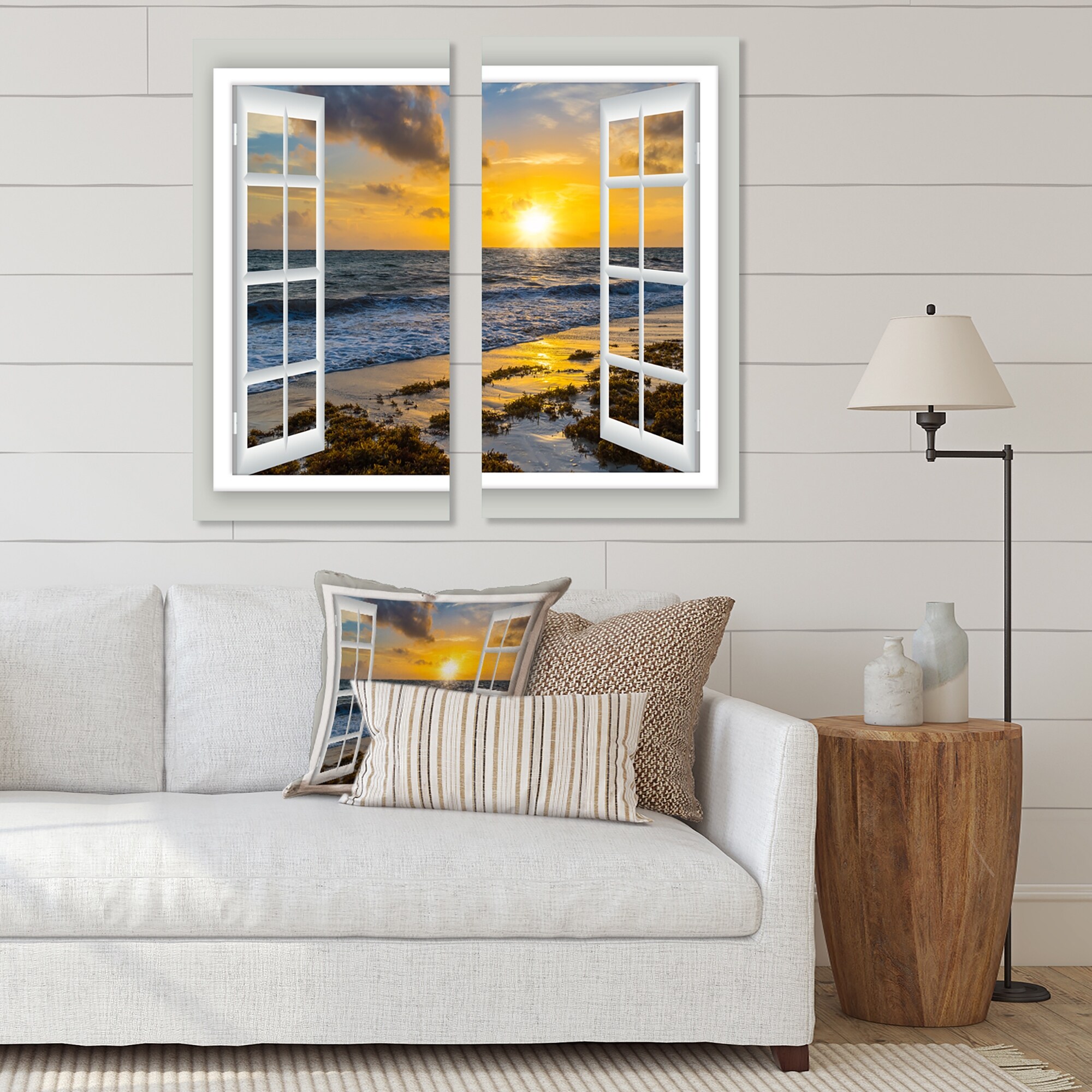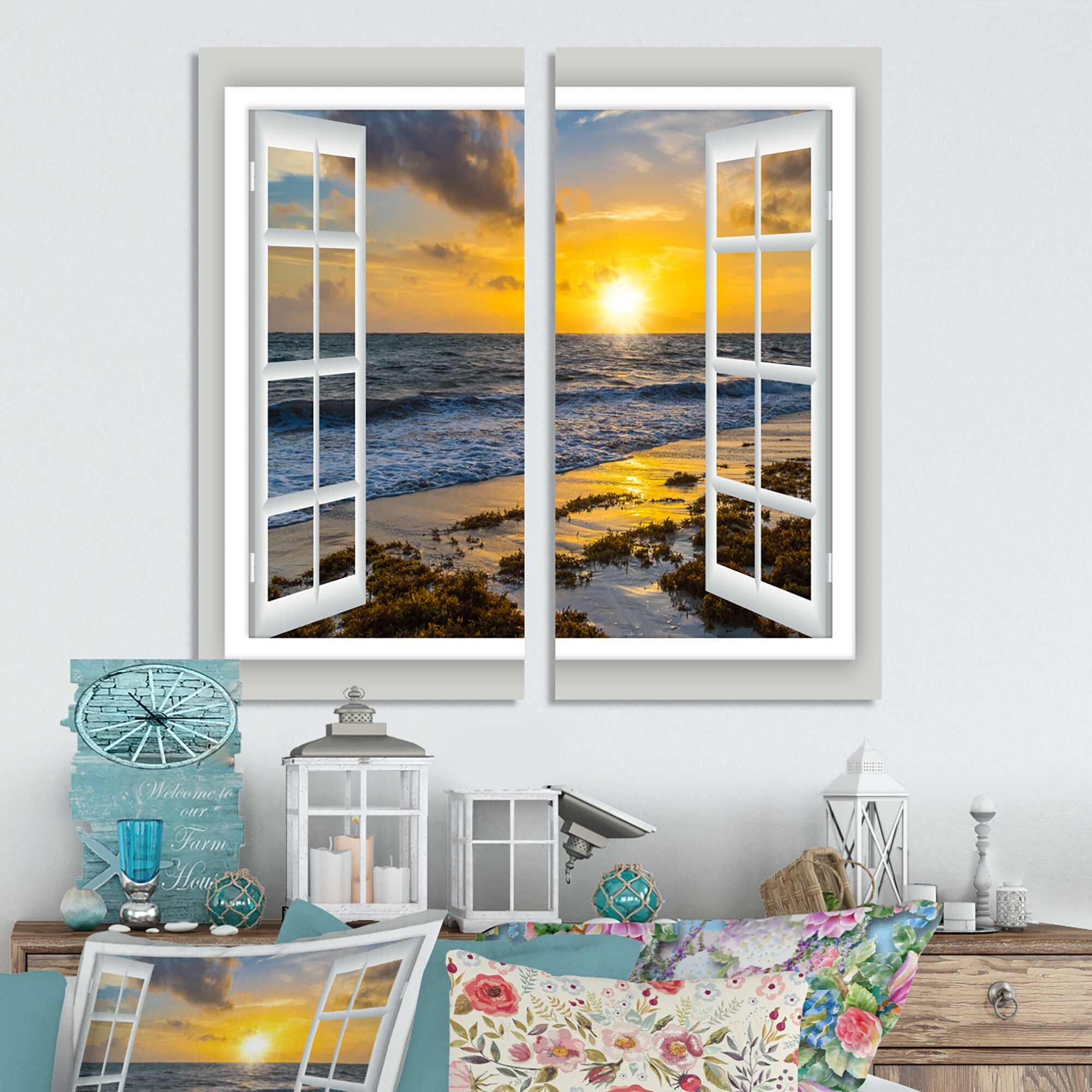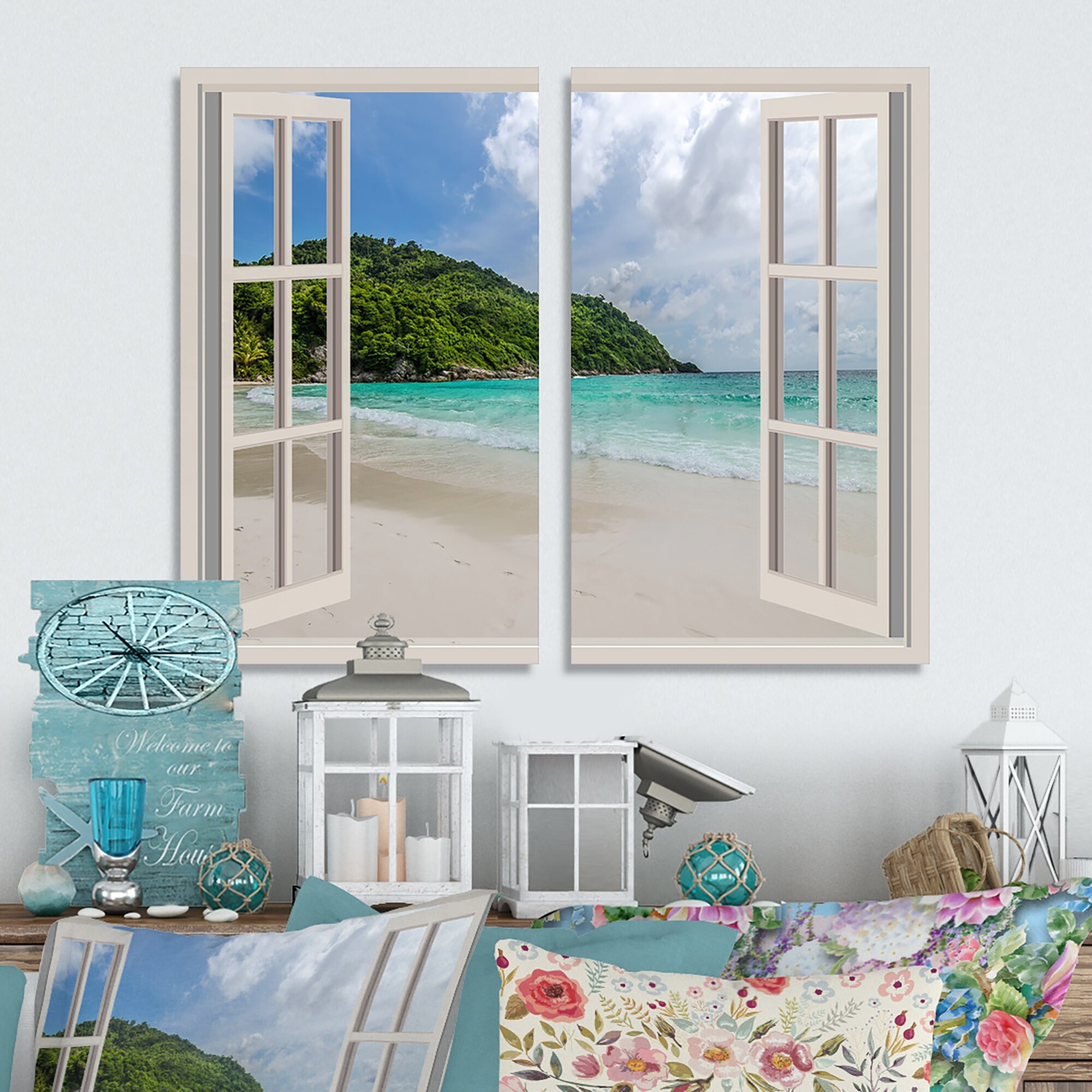 Designart "Open Window to Calm Seashore" Seashore Canvas Wall Art Print 2 Piece Set