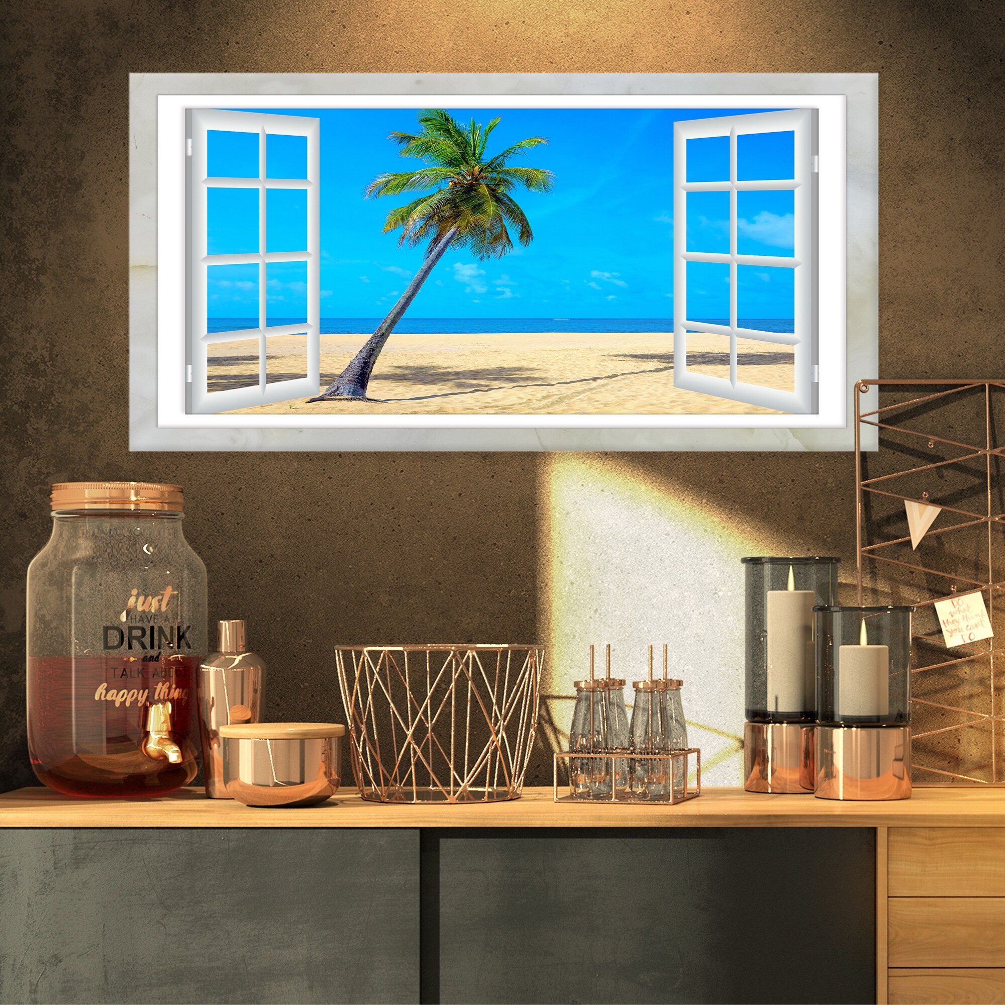 Designart "Window Open to Beach with Palm" Extra Large Seashore Canvas Art