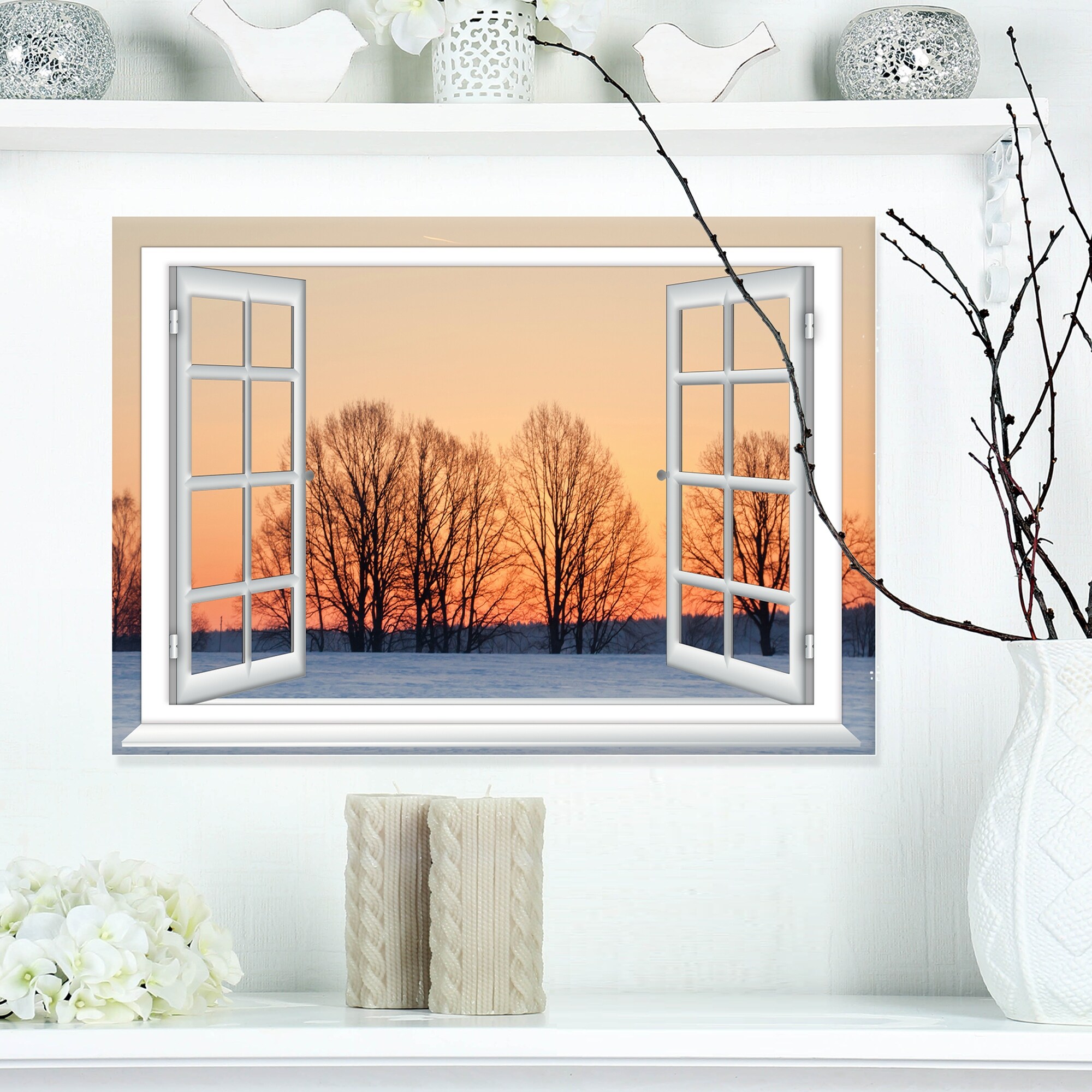 Designart "Open Window to Snowy Sunset" Landscape Canvas Art Print