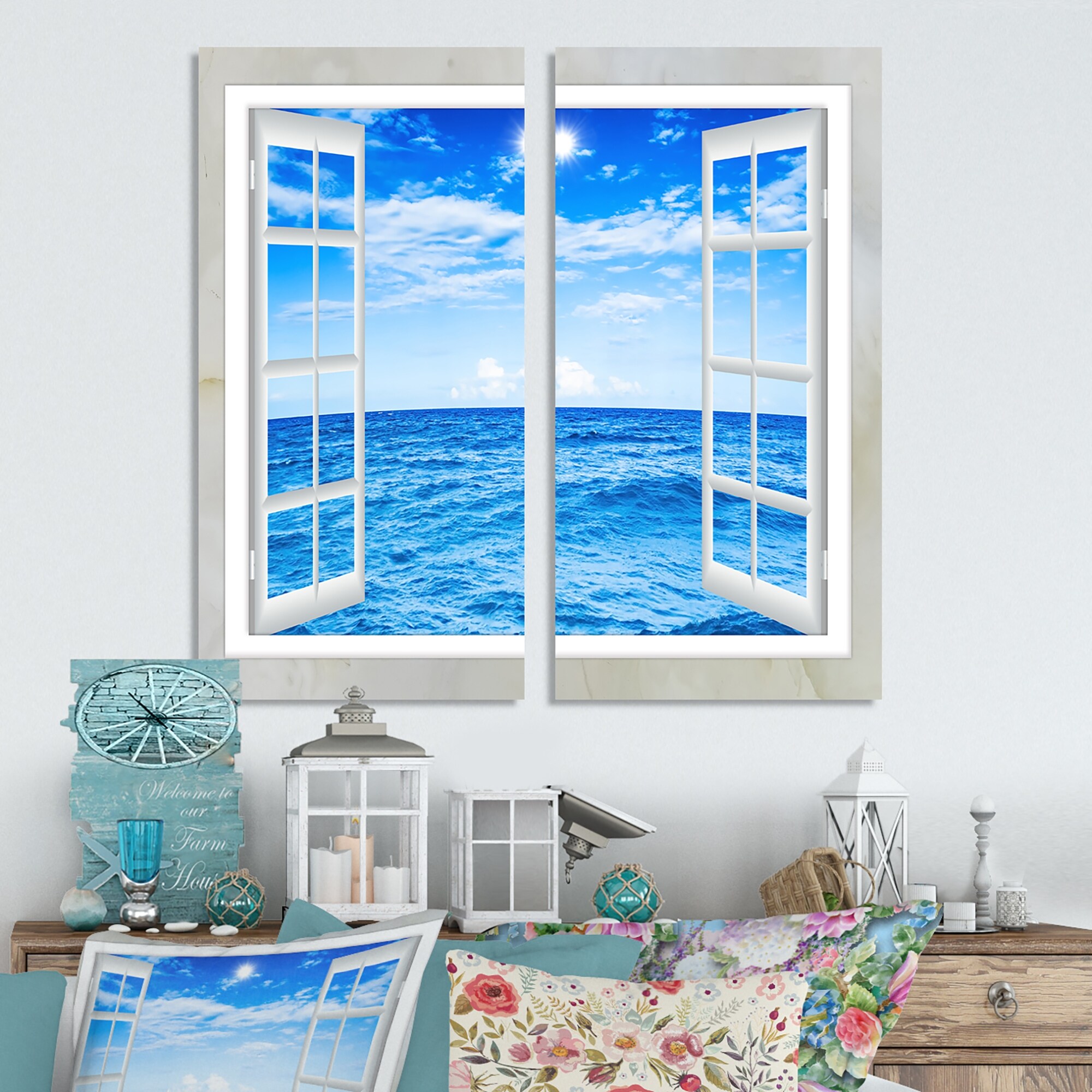 Designart "Window Open to Blue Wavy Ocean" Seashore Canvas Wall Art Print 2 Piece Set