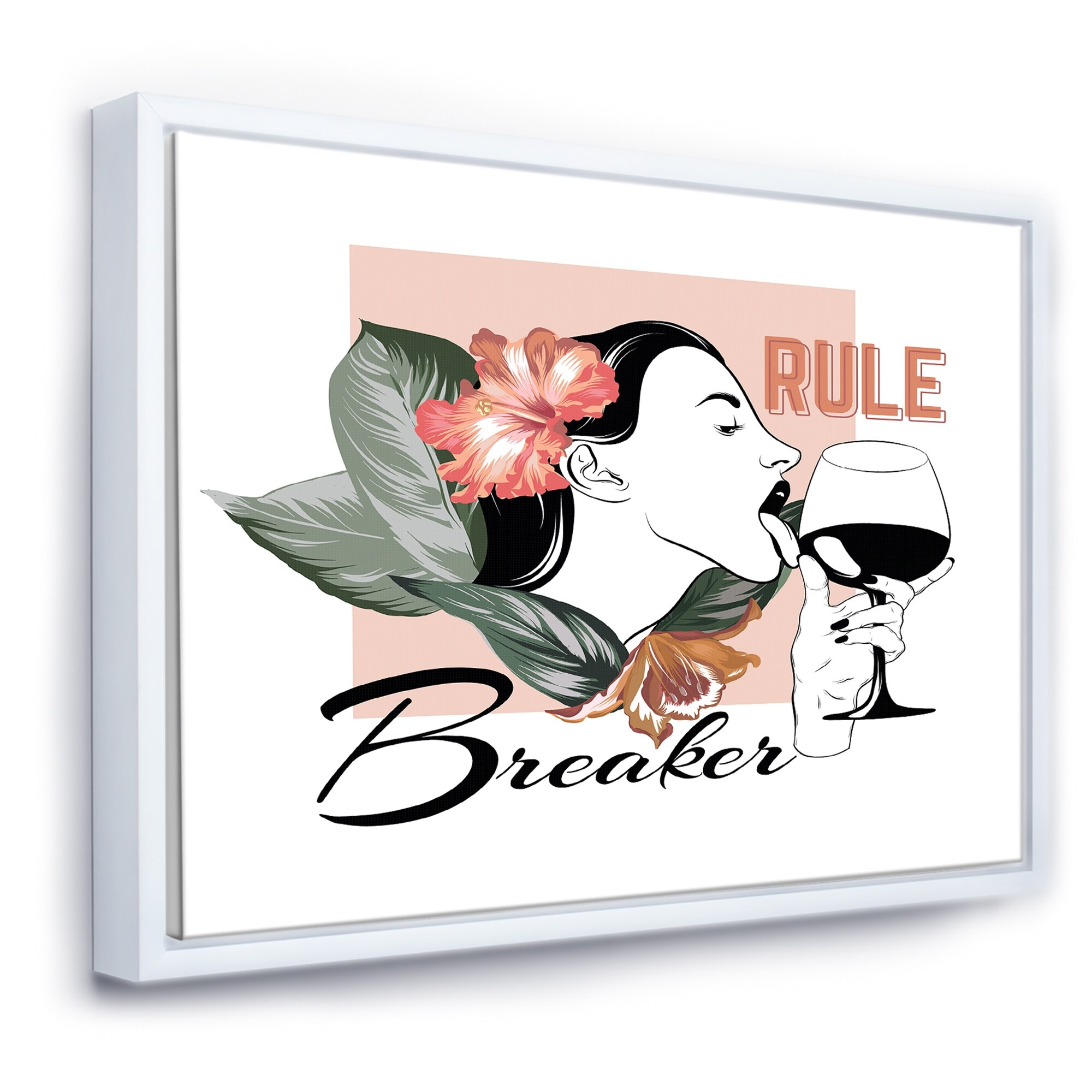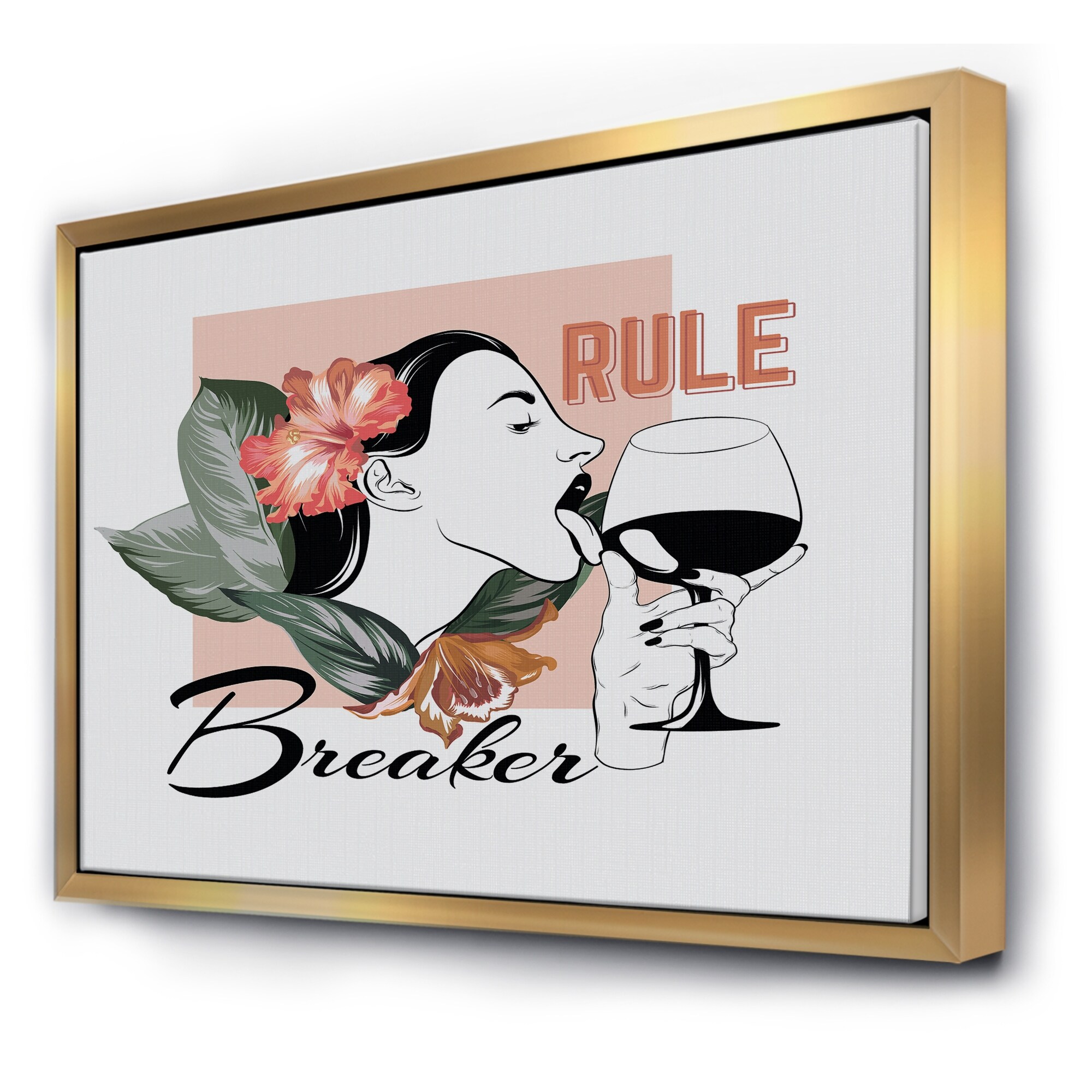 Designart "Rule Breaker Suggestive Girl With Glass of Wine And Flowers" Modern Framed Canvas Wall Art Print