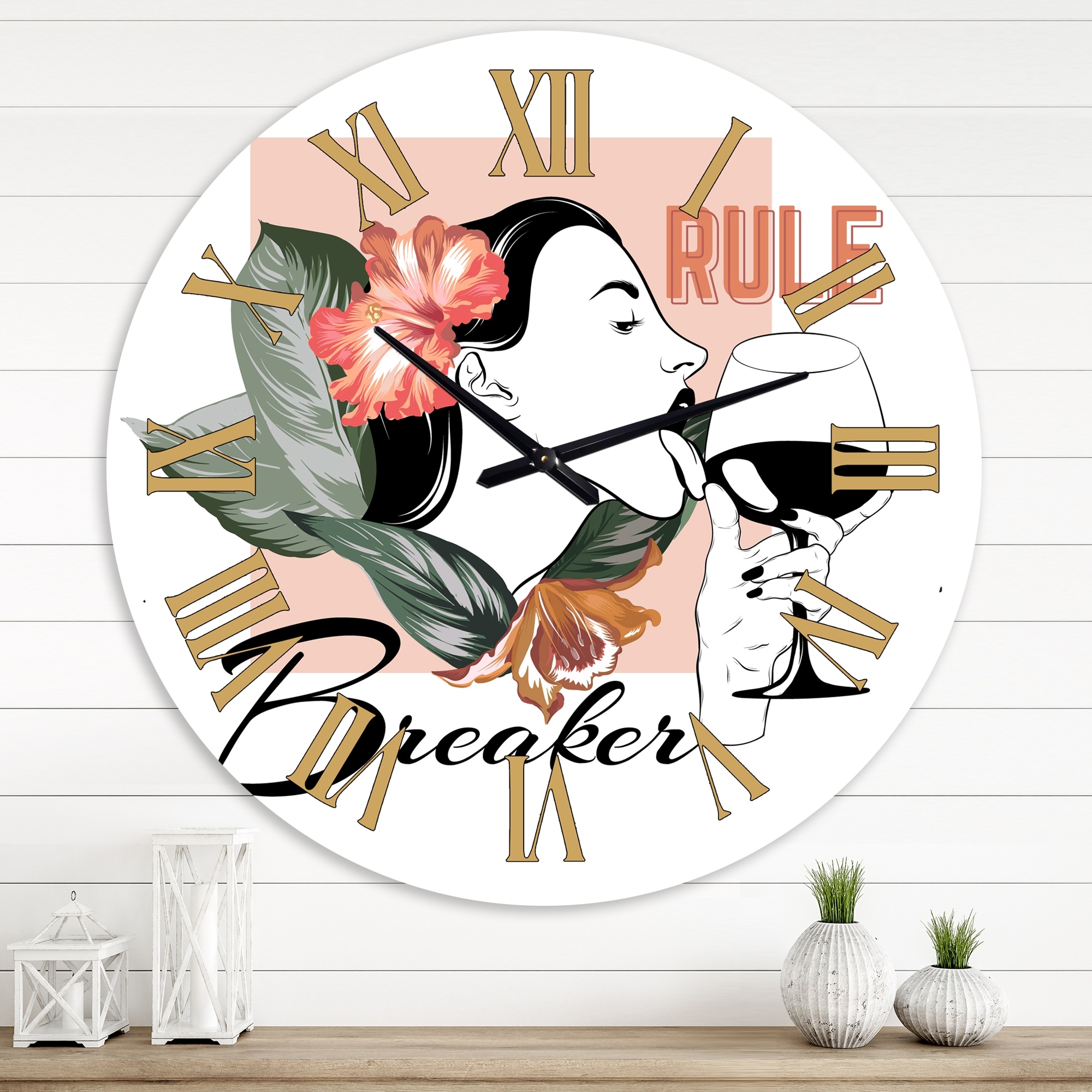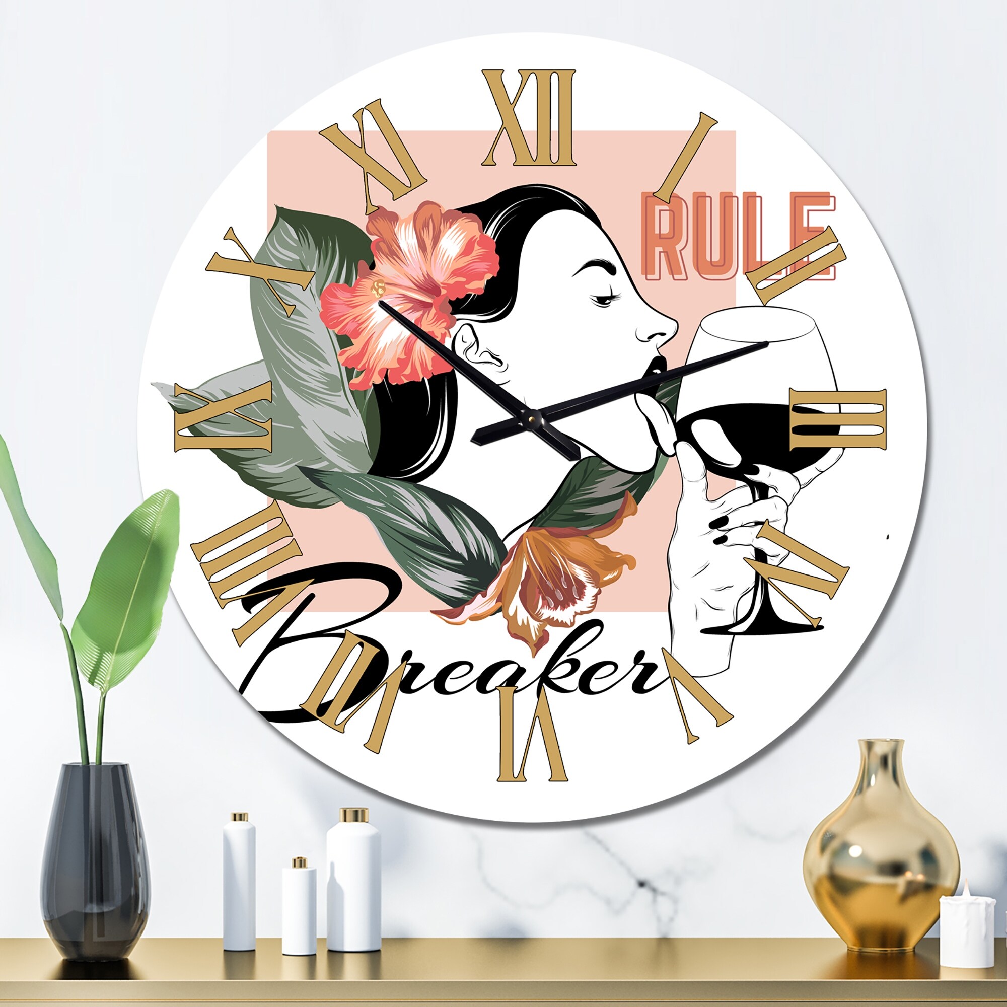 Designart 'Rule Breaker Suggestive Girl With Glass of Wine and Flowers' Modern wall clock