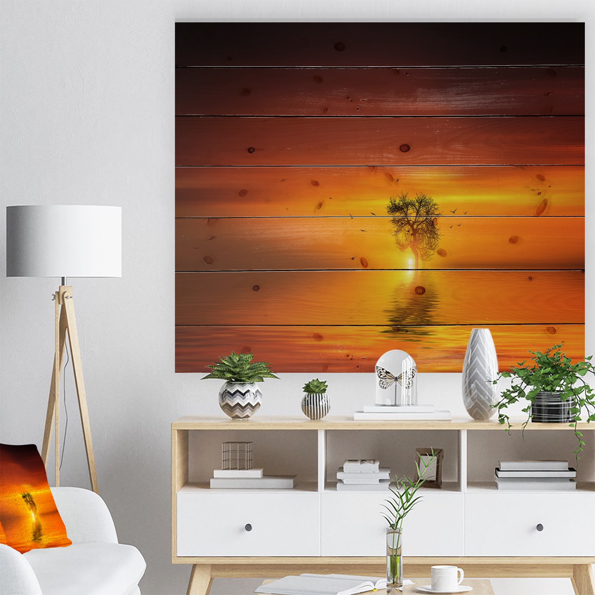 Designart 'Wonderful Tree with Birds at Sunset' Landscape Print on Natural Pine Wood - Multi-color