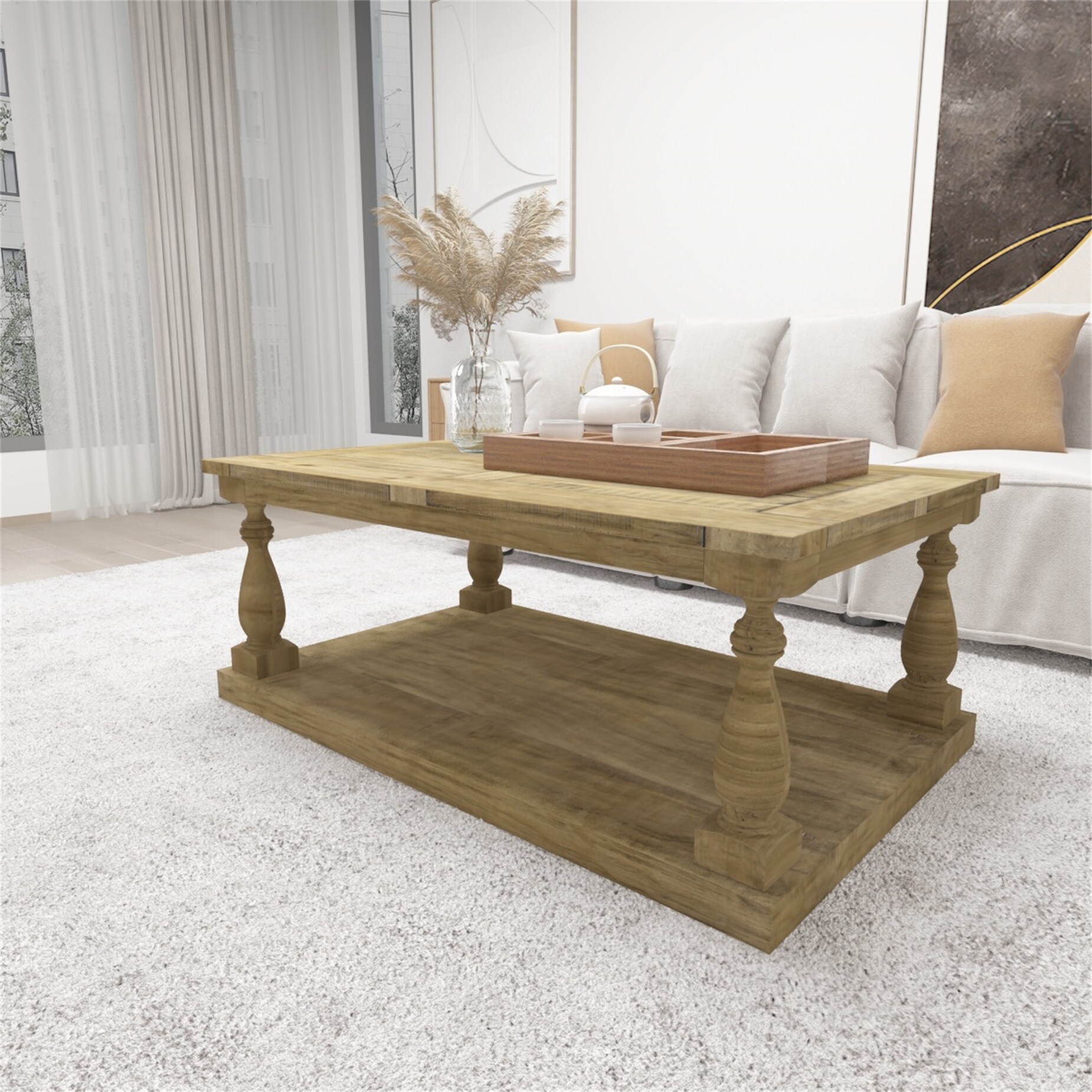 Rustic Floor Shelf Coffee Table with Storage, Solid Pine Wood