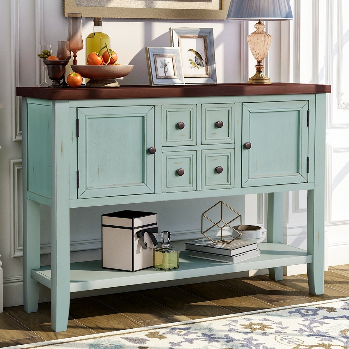 Wooden Console Table with 4 Storage Drawers and 2 Cabinets, Sofa Table with Bottom Shelf and Solid Wood Legs