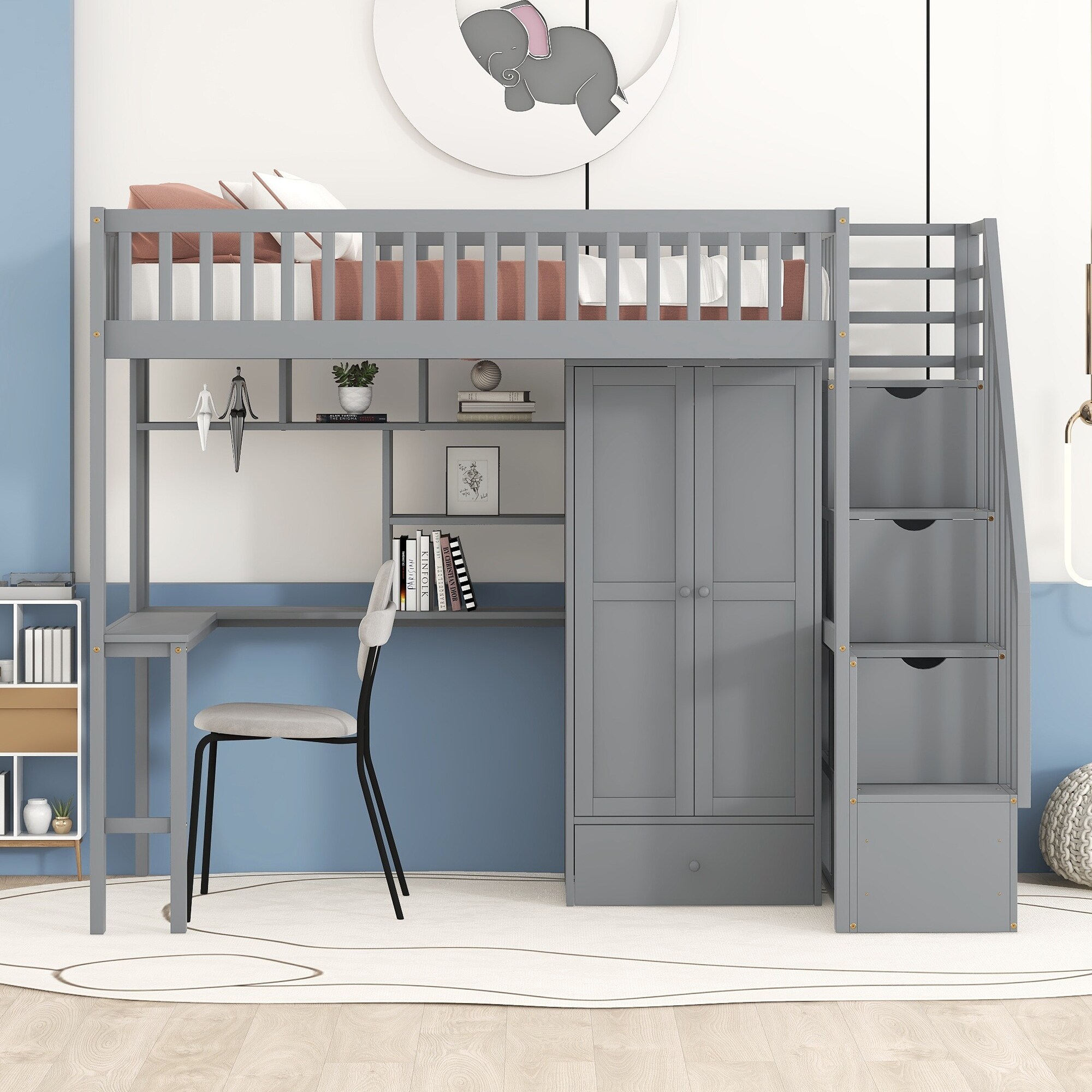 Twin Size Wooden Loft Bed with 7 Drawers, 2 Shelves and Desk, Grey