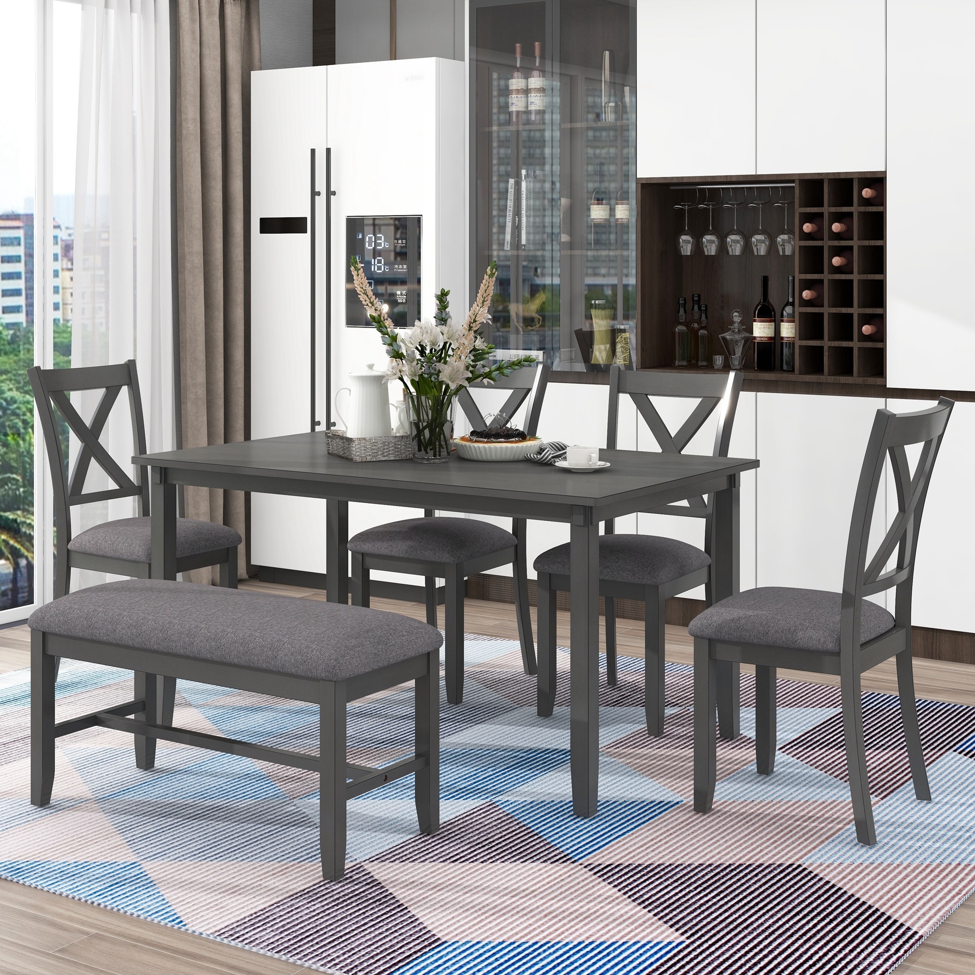 6-Piece Set, Wooden Rectangular Dining Table and Chair, Bench and 4 cross-backed dining Chairs