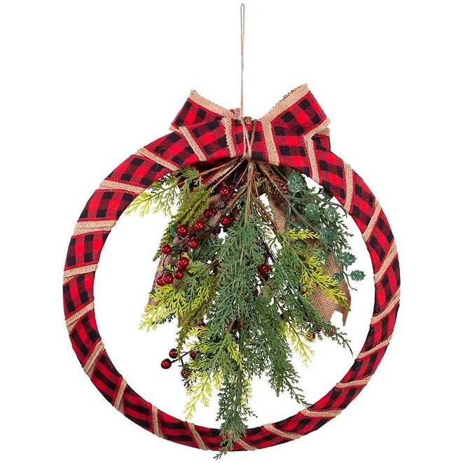Kurt Adler 18-Inch Fabric Red Plaid Wreath with Foliage