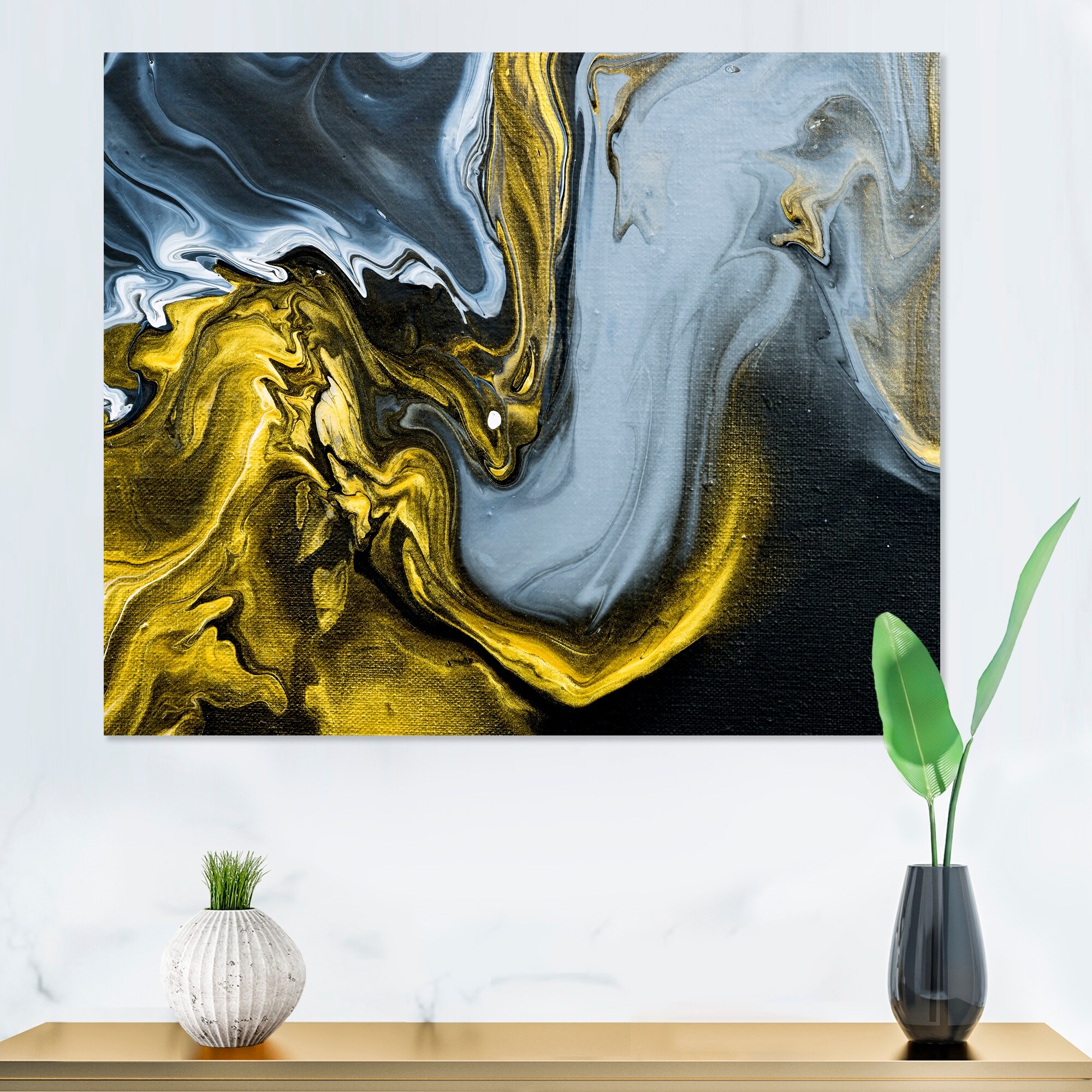 Designart "Yellow Black And White Liquid Art IV" Modern Framed Canvas Wall Art Print