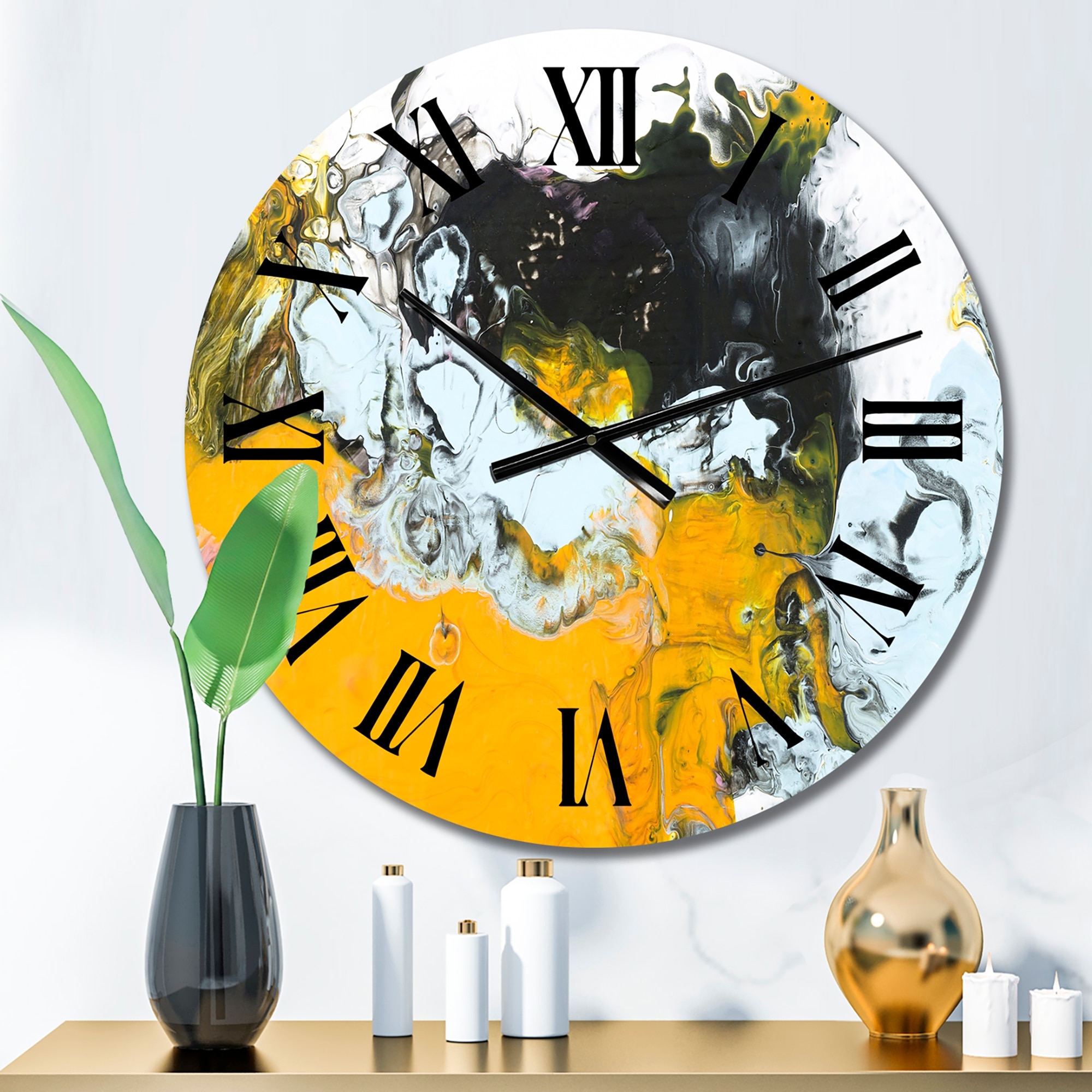Designart 'Yellow Black And White Liquid Art I' Modern wall clock
