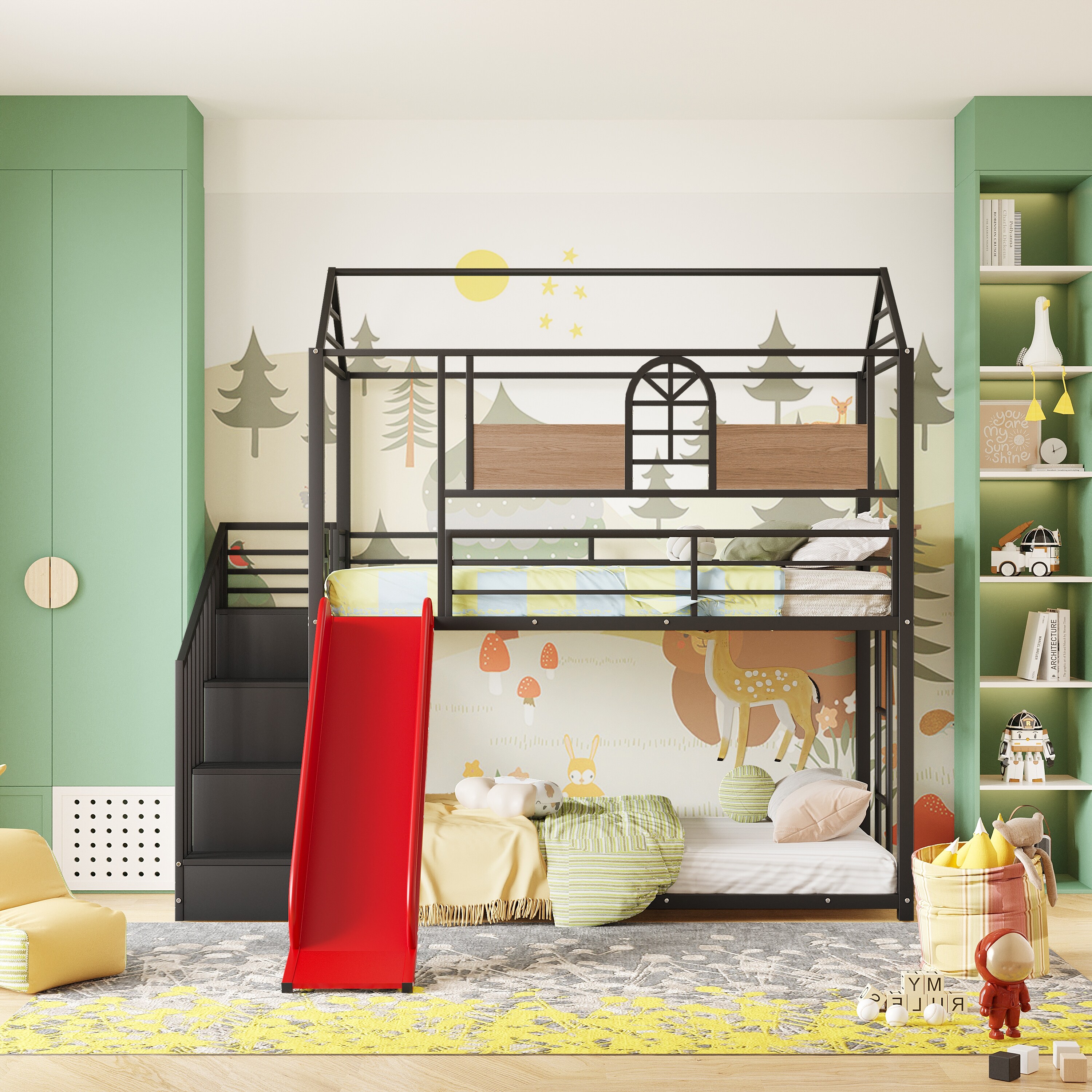 Twin Over Twin Metal Bunk Bed with Slide and Ladder