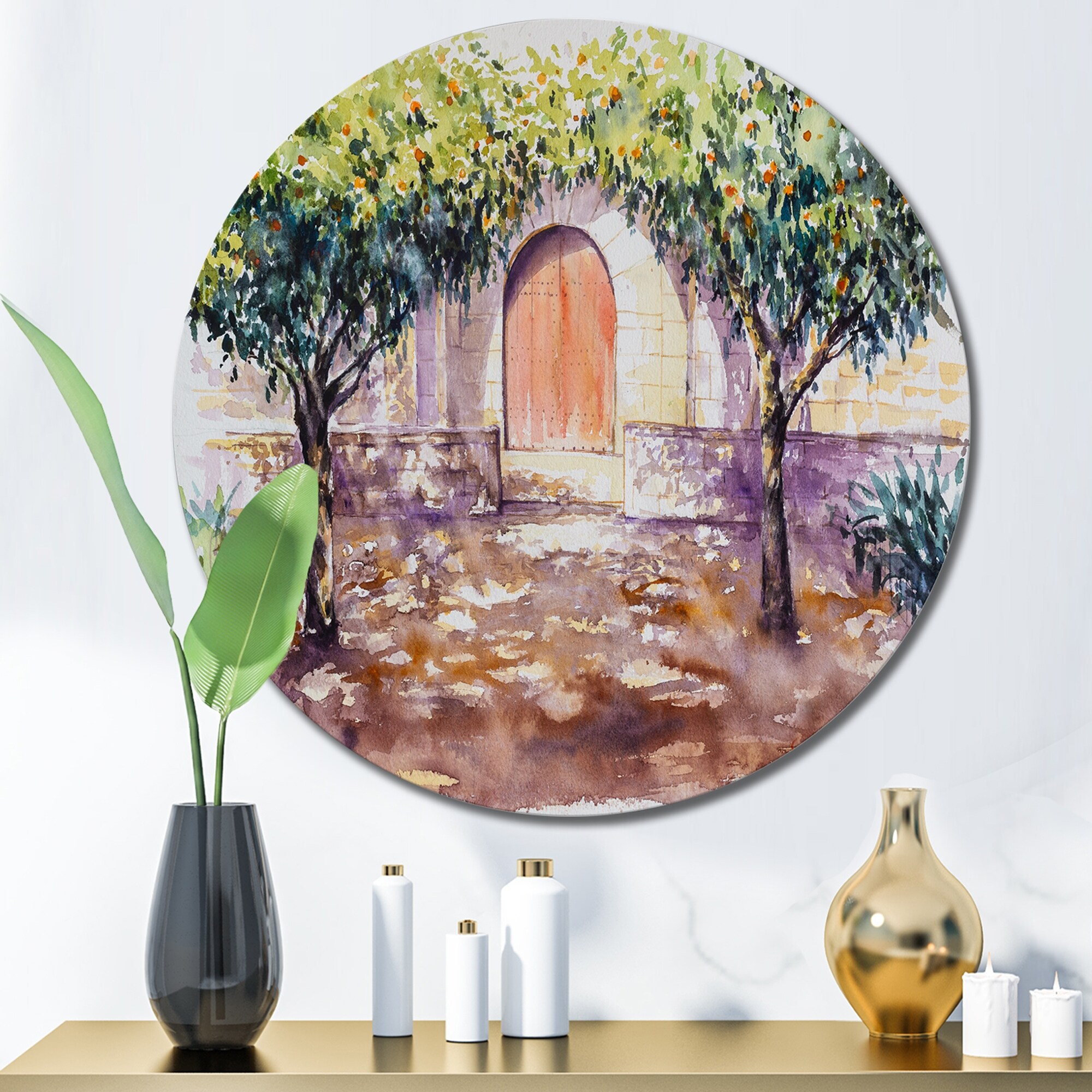 Designart 'Backyard Library in Barcelona With Orange Trees' Traditional Metal Circle Wall Art