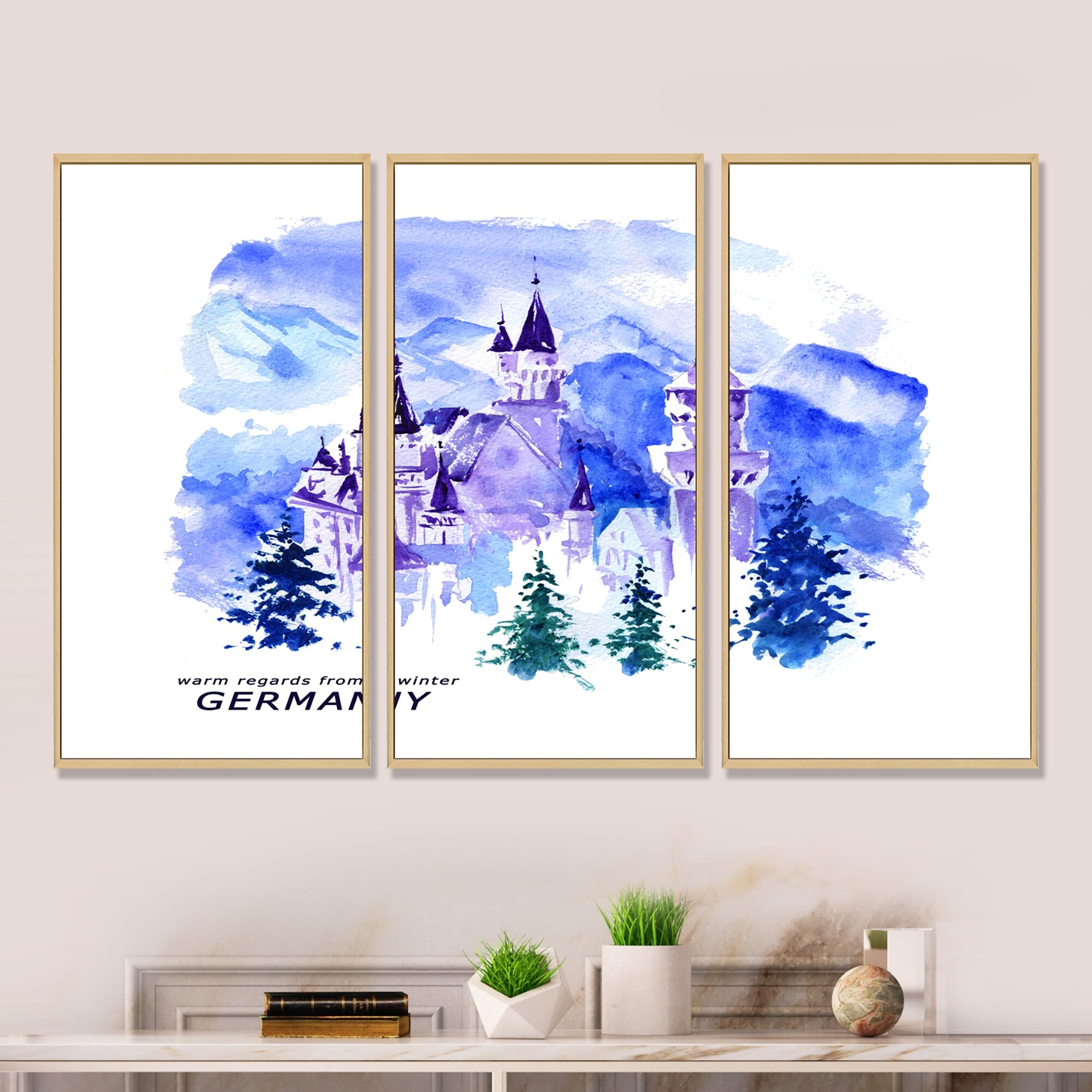 Designart "Germany Watercolor Landscape" Cityscape Framed Canvas Wall Art Print Set of 3 - 4 Colors of Frames