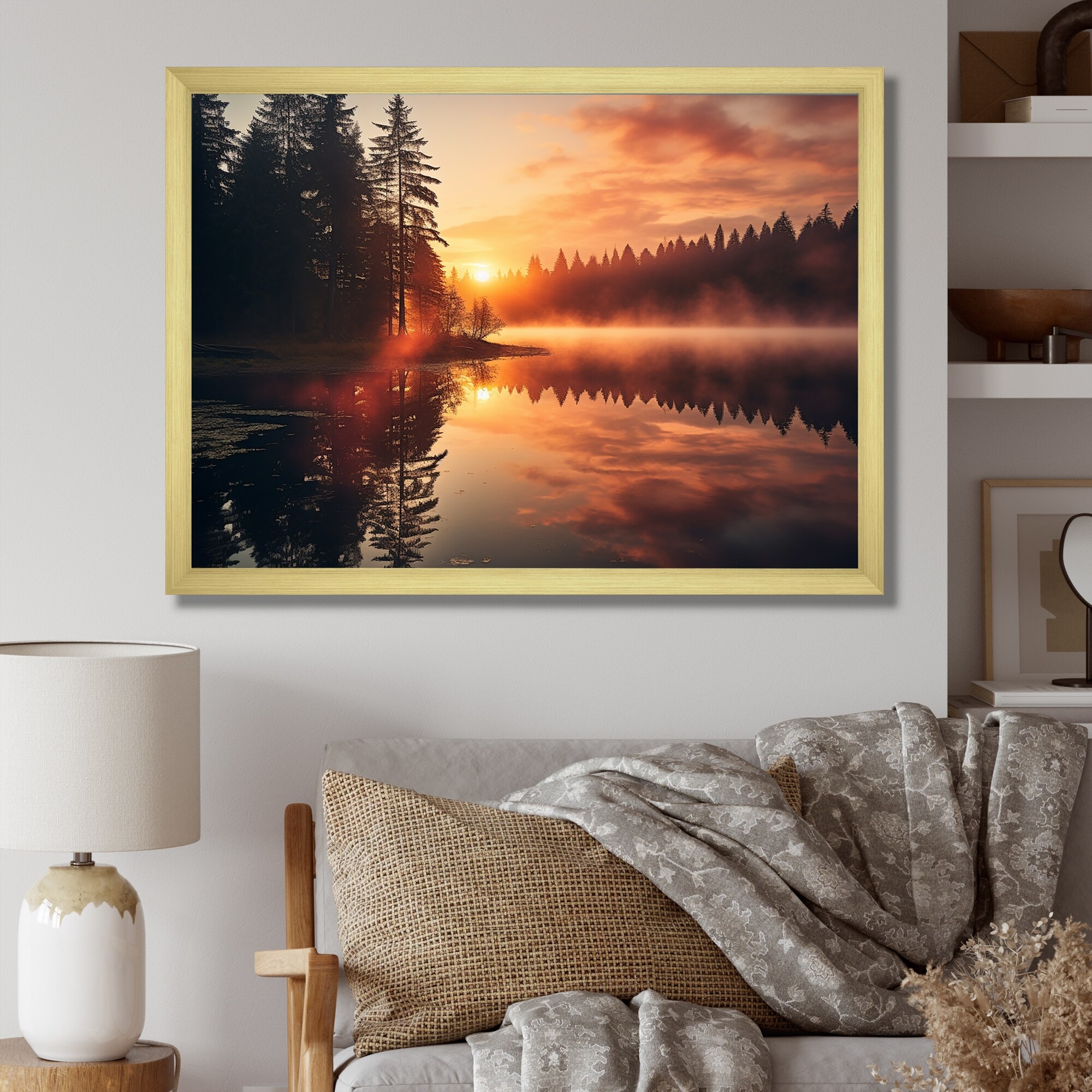 Designart "Pink Morning Mist At the Lake Sunrise" Landscape Lake Framed Wall Decor