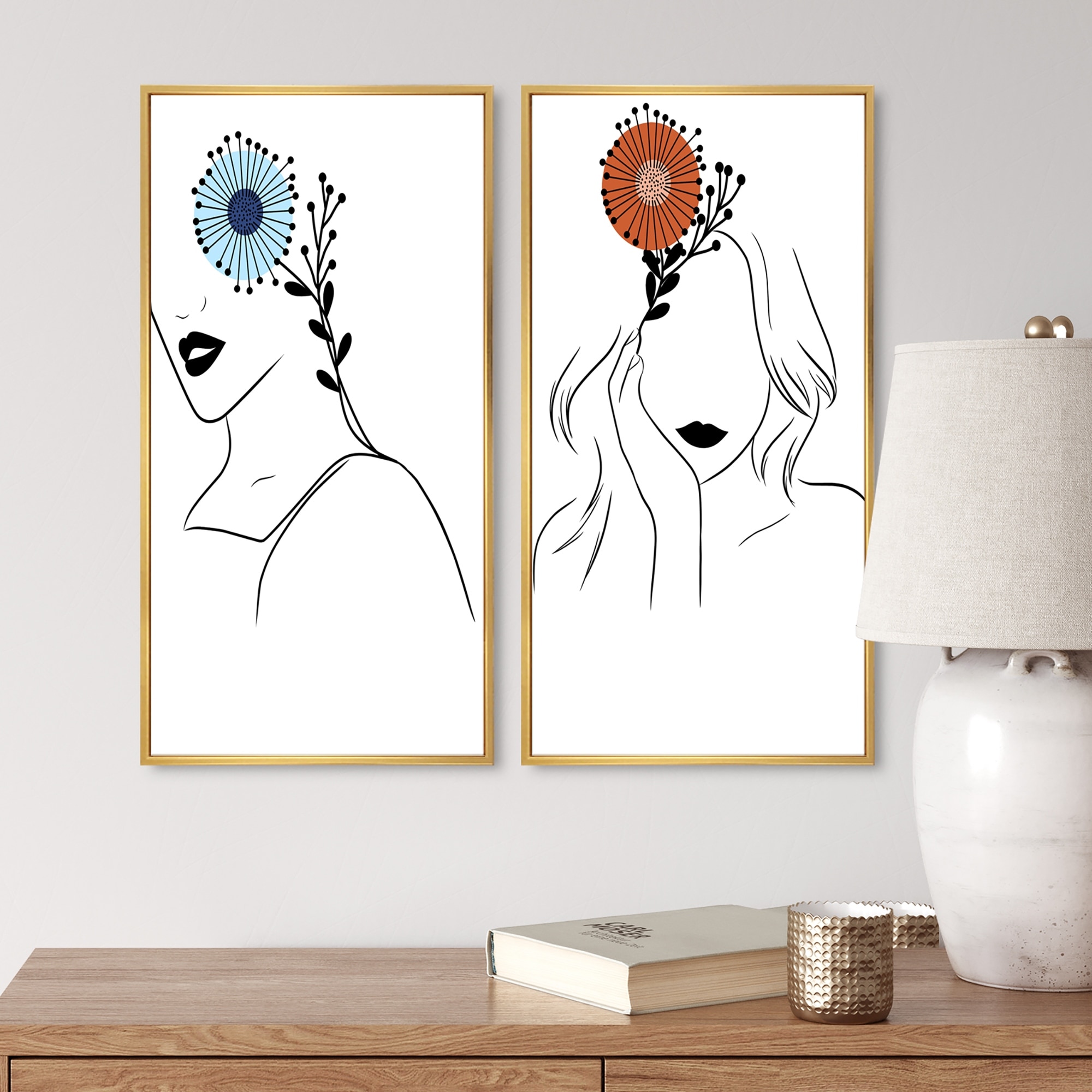 Designart "Minimalism Woman Floral Portrait I" Portrait Framed Art Set of 2 Pieces