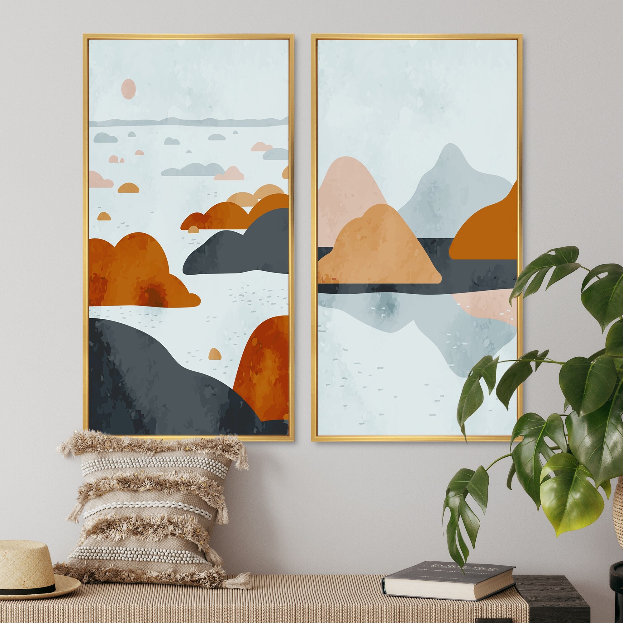 Designart "Abstract Retro Landscape in Vintage Tones II" Geometric Framed Art Set of 2 Pieces
