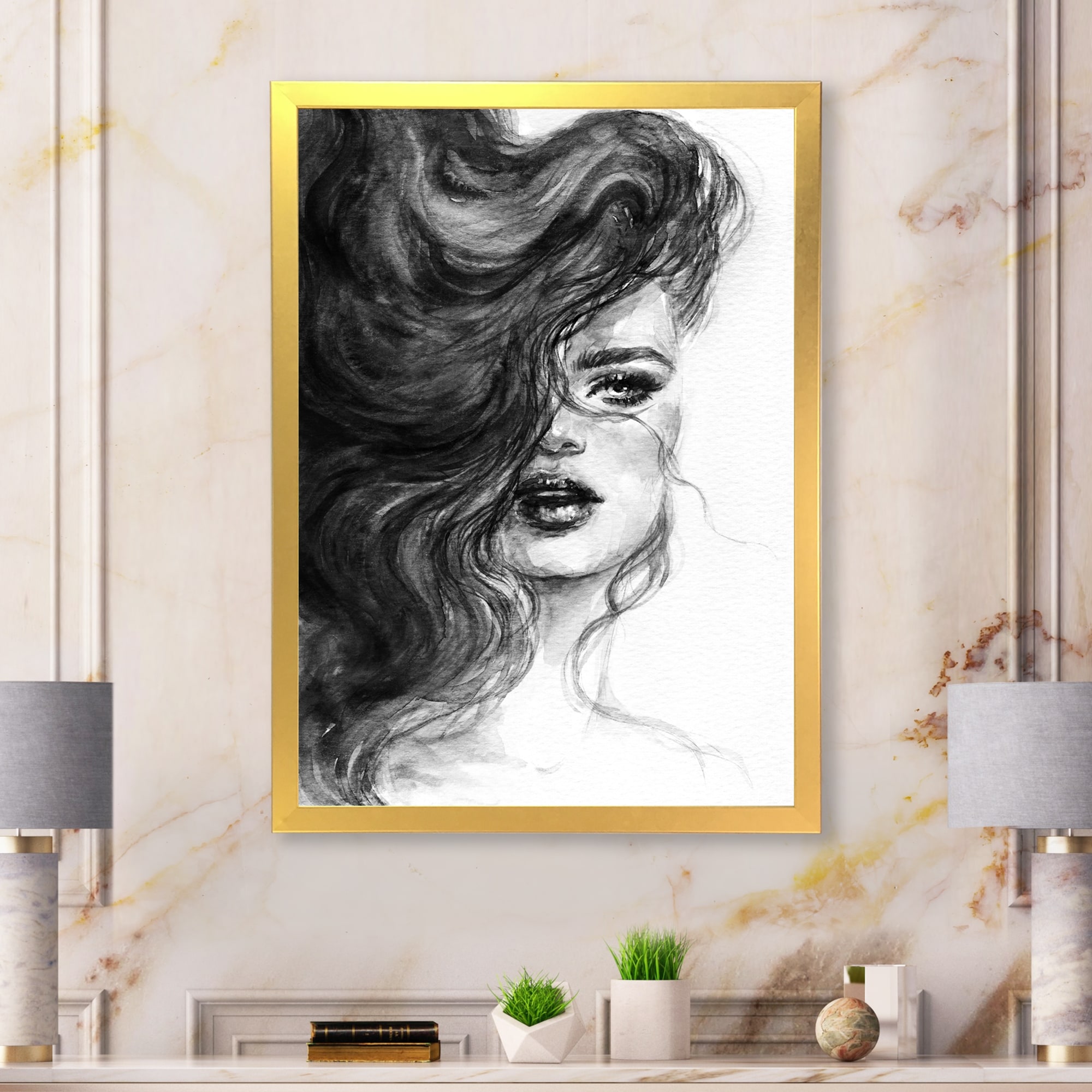 Designart "Monochrome Portrait of Woman With Wavy Hair" Glam Framed artwork