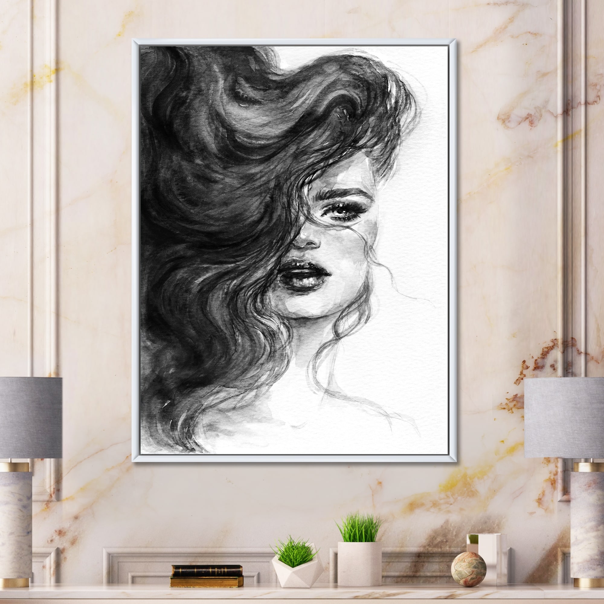Designart "Monochrome Portrait of Woman With Wavy Hair" Glam Framed Canvas artwork