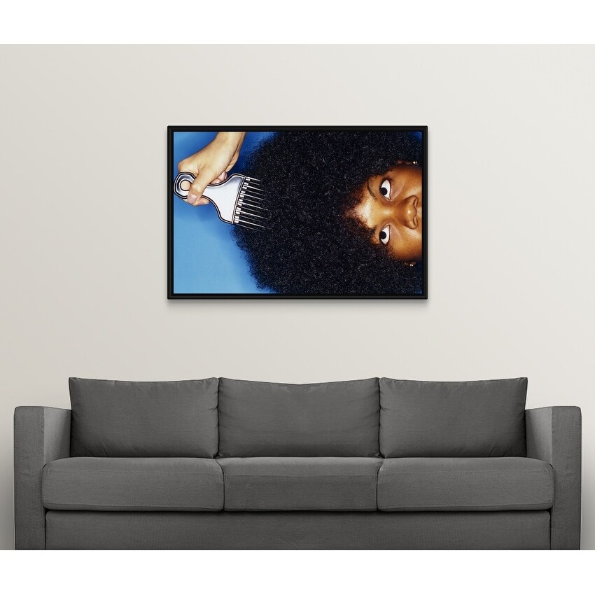 "Woman having hair picked out" Black Float Frame Canvas Art
