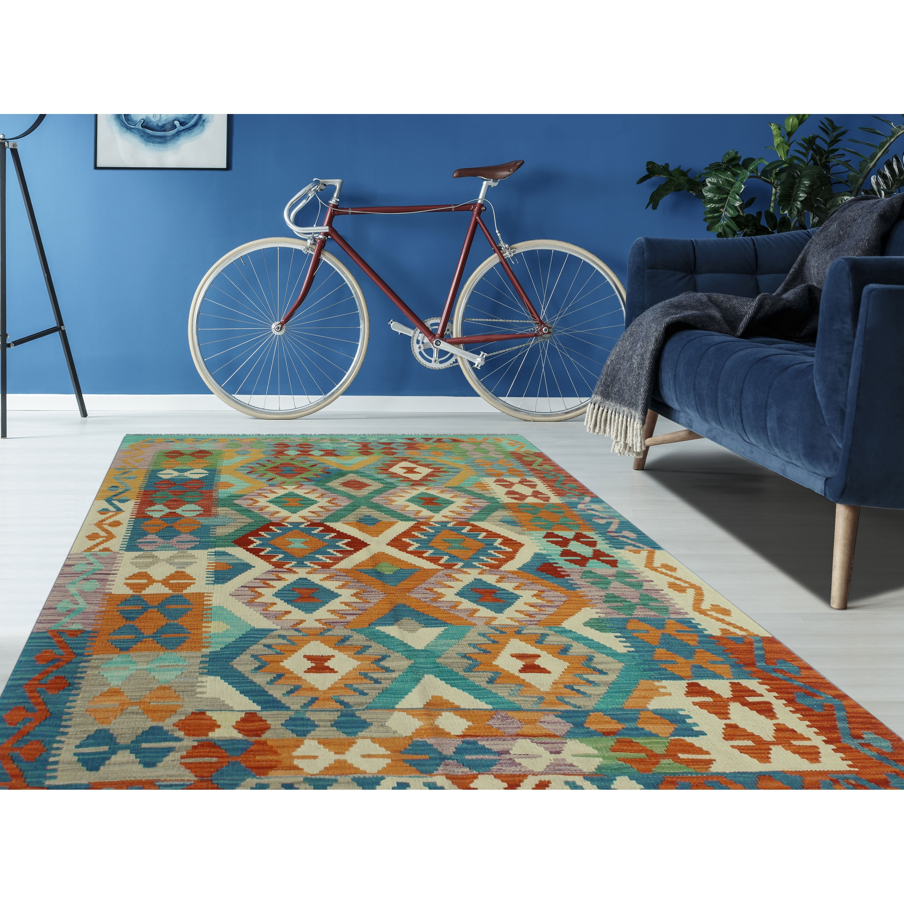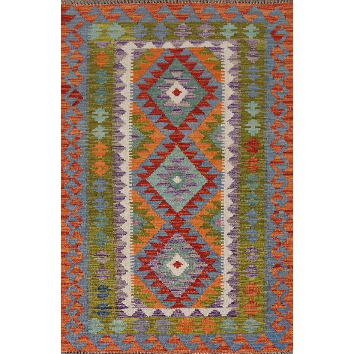 Hand-Woven Sangat Kilim Chinue Blue/Orange Rug - 5'1" x 6'4"