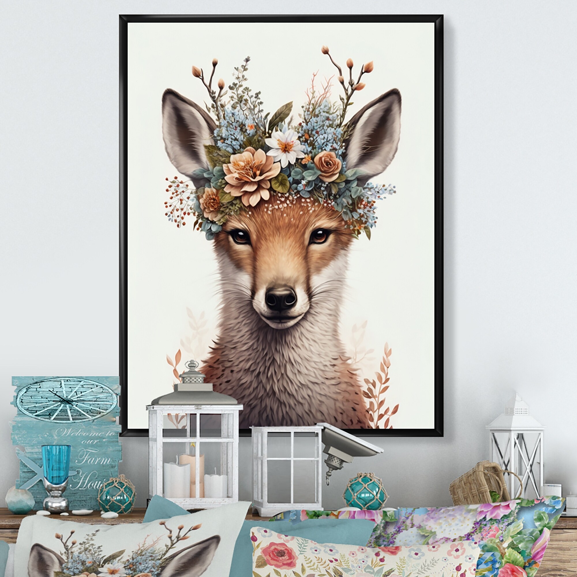 Designart "Cute Baby Fox With Floral Crown V" Animals Framed Canvas Art Print