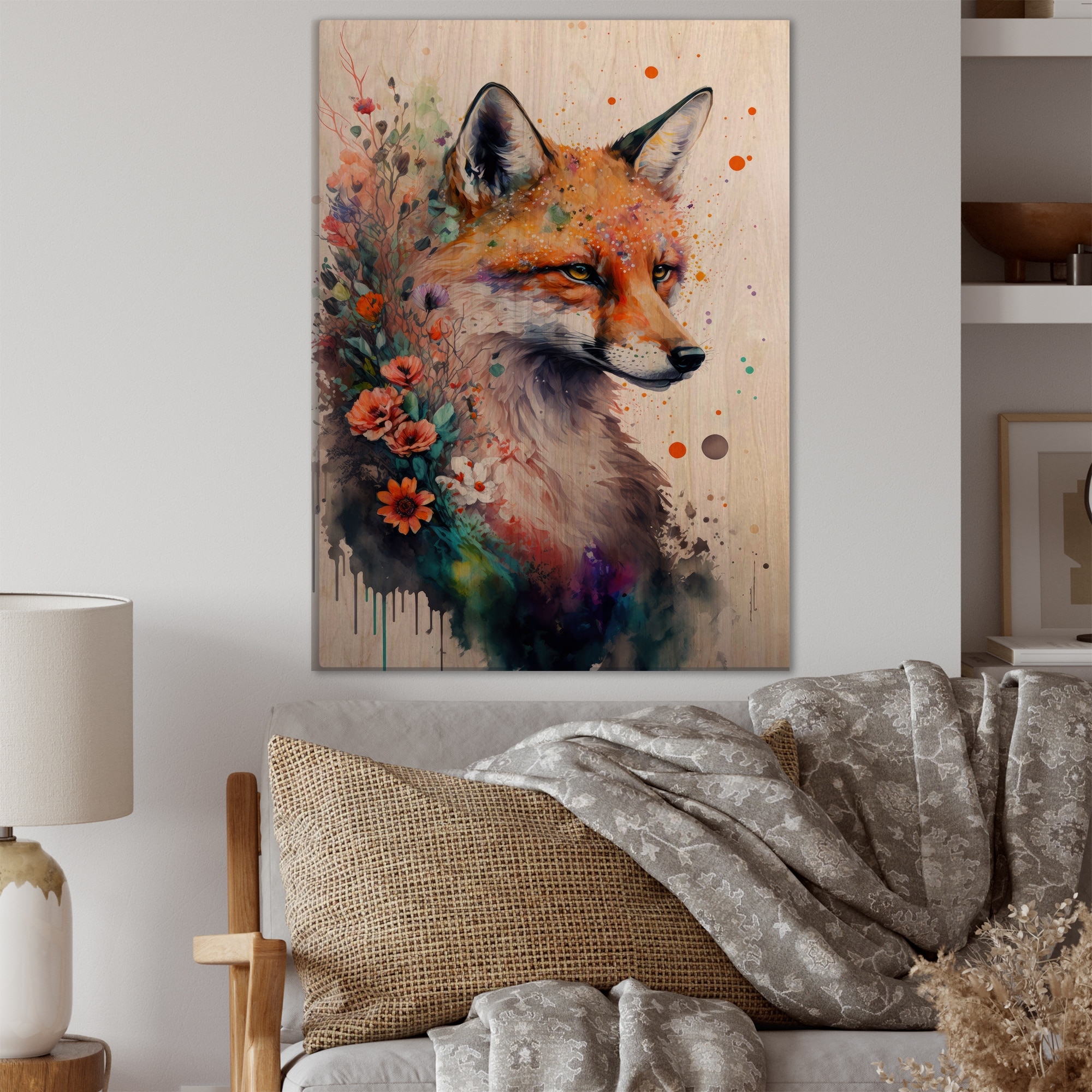 Designart 'Cute Fox Floral Art I' Animals Fox Wood Wall Art - Natural Pine Wood
