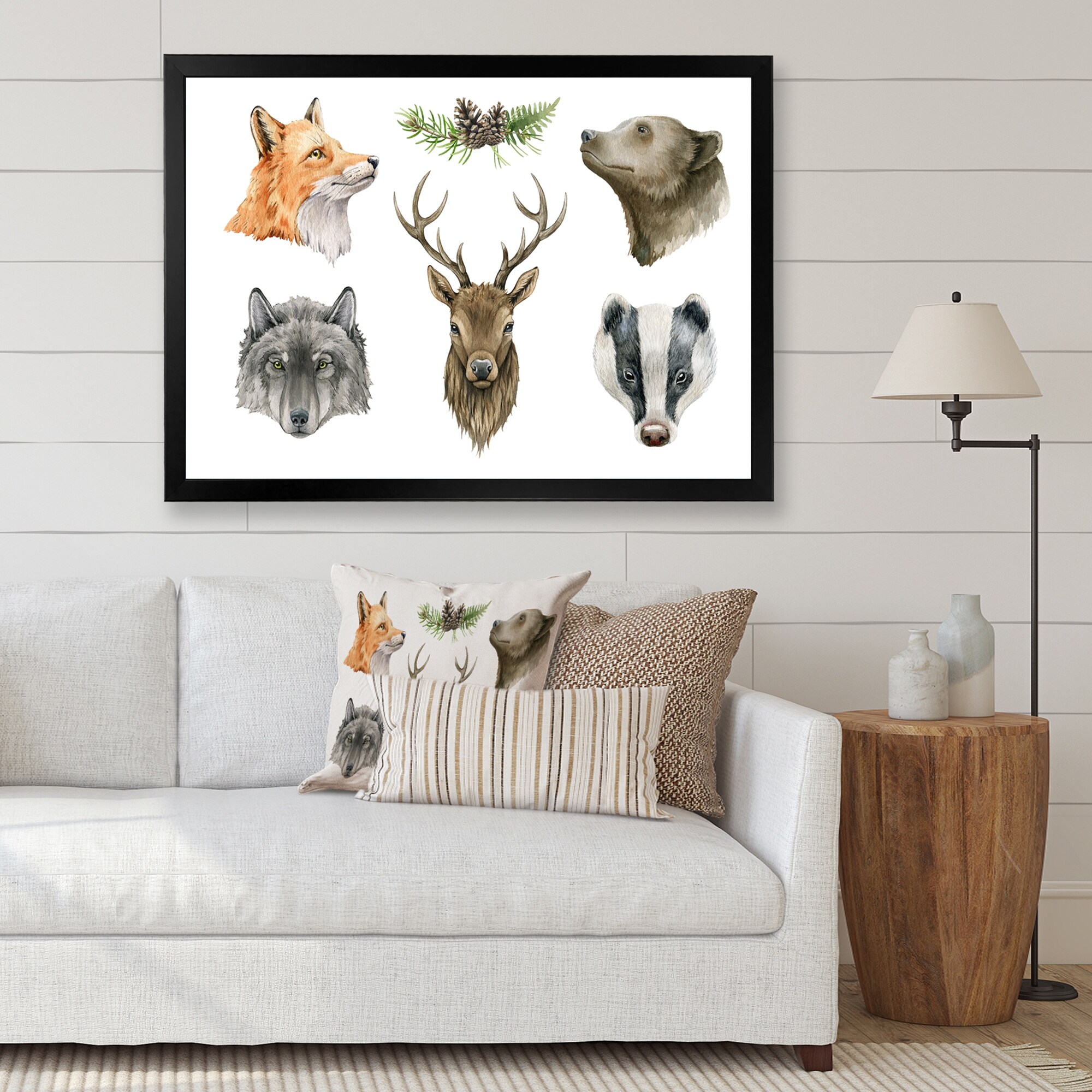 Designart "Fox Wolf Grizzly Bear Badger And Deer Head" Traditional Framed Art Print
