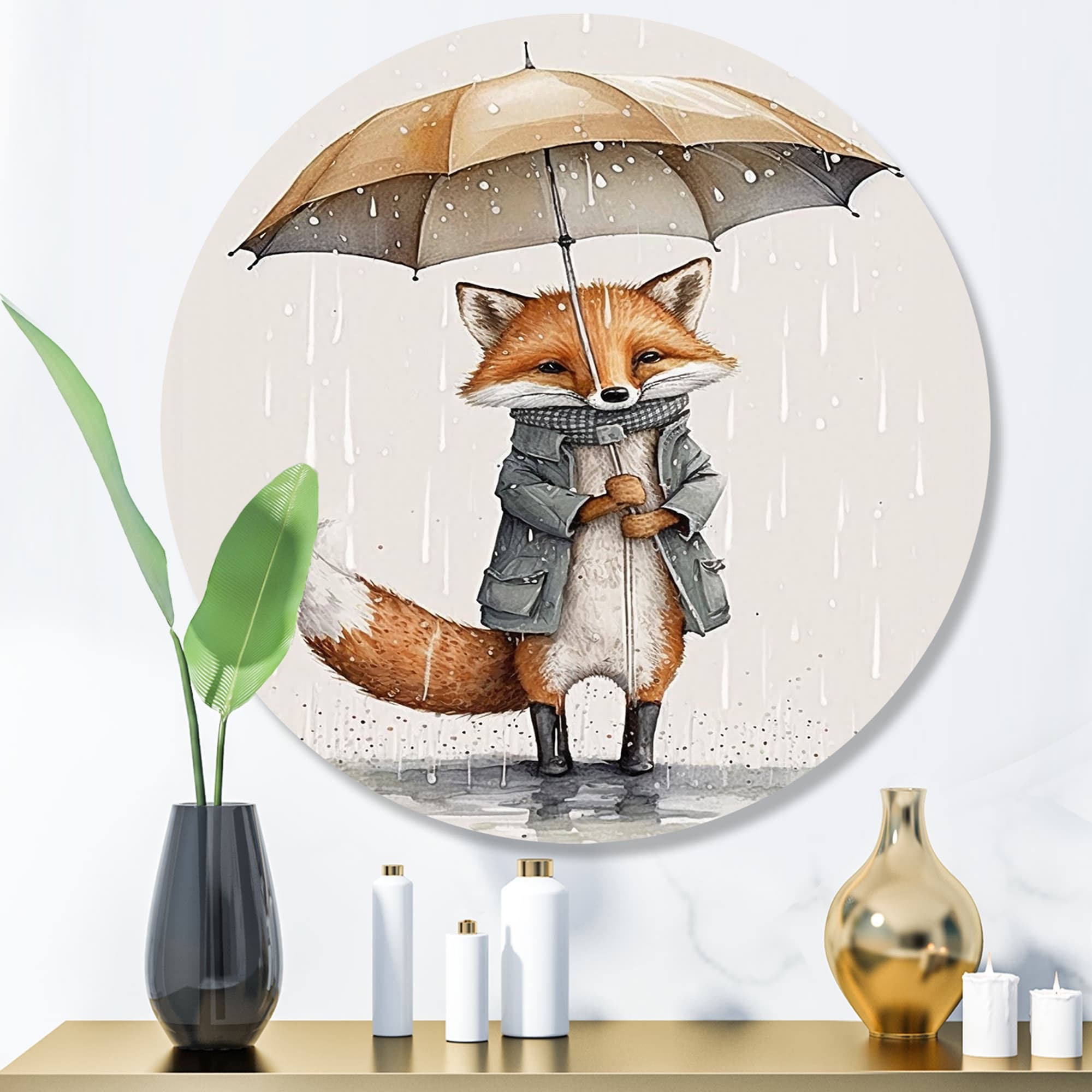 Designart "Cute Fox With Umbrella Rainy Day" Animals Fox Metal Round Wall Art