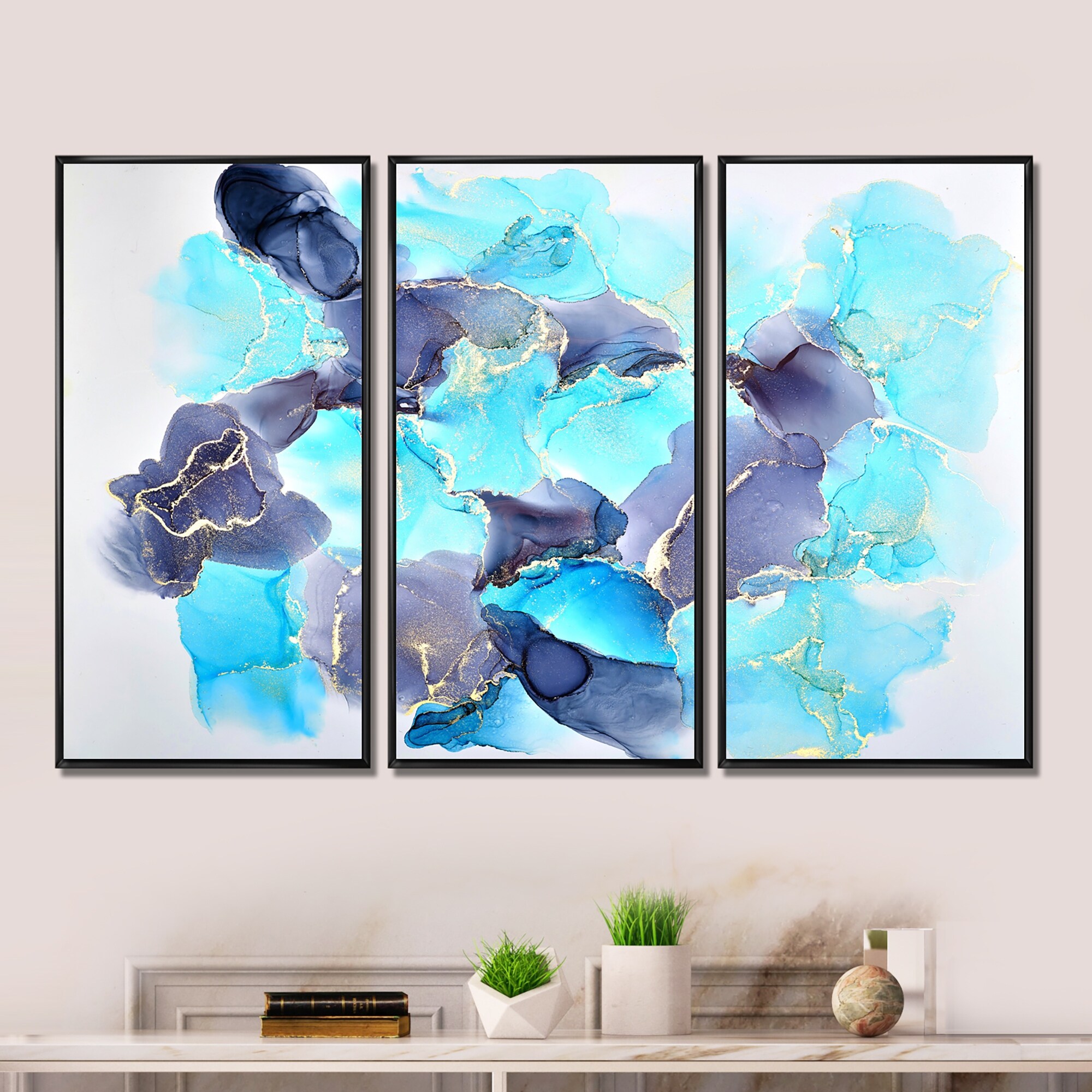 Designart "Turquoise Luxury Abstract Fluid Art III" Modern Framed Wall Art Set of 3 - 4 Colors of Frames