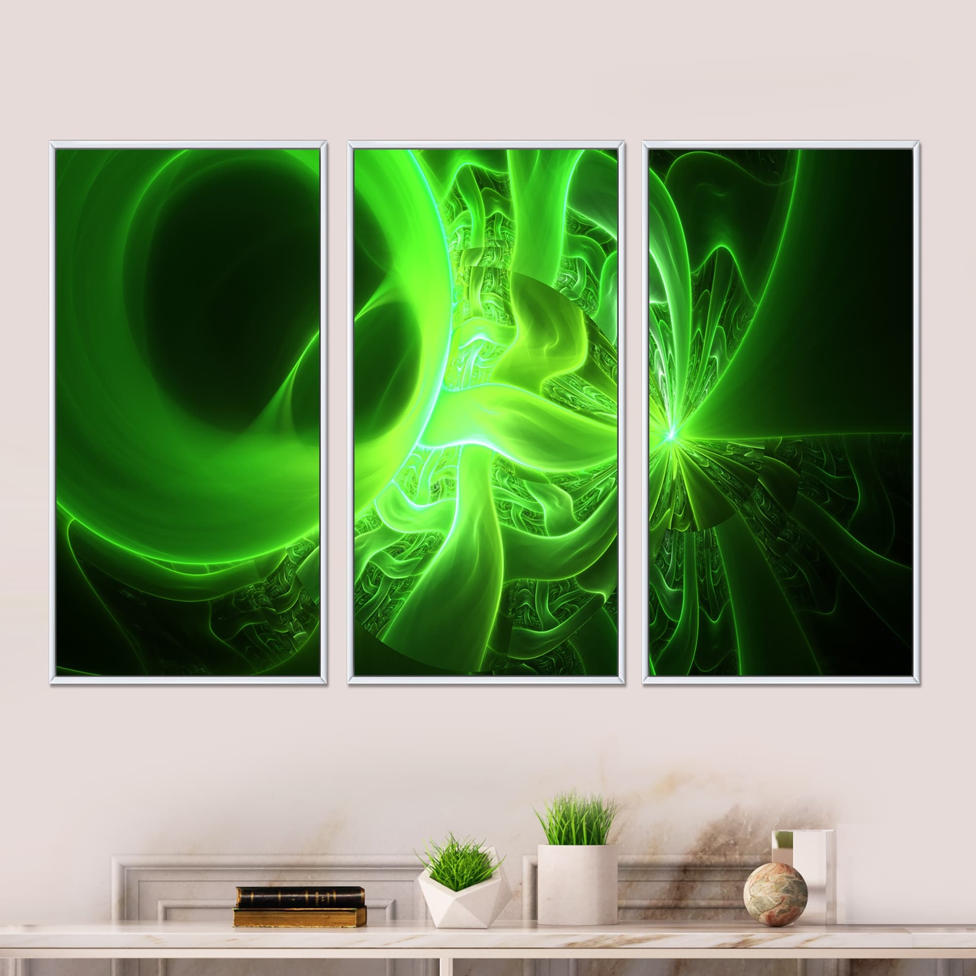 Designart "Bright Green Designs on Black" Abstract Framed Canvas Wall Art Print Set of 3 - 4 Colors of Frames