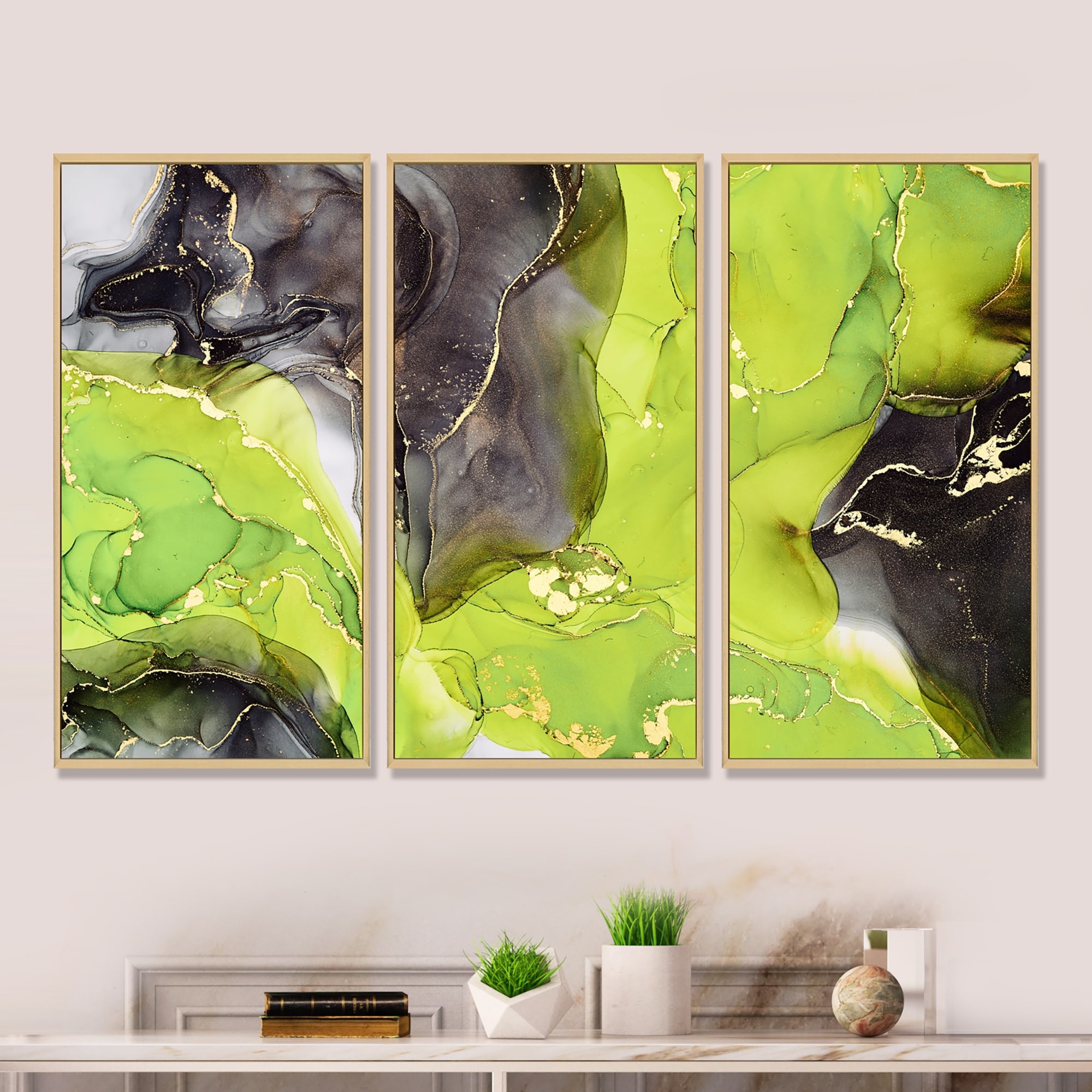 Designart "Green And Black Luxury Abstract Fluid Art I" Modern Framed Art Prints Set of 3 - 4 Colors of Frames