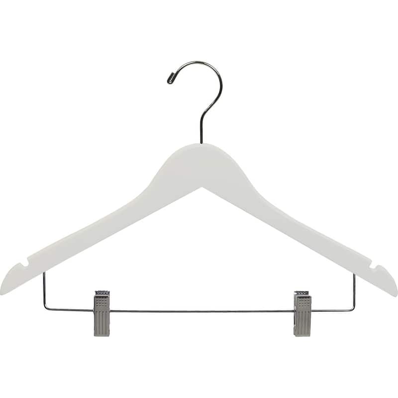 White Rubberized Wooden Combo Hangers with Adjustable Cushion Clips, Flat Rubber Coated with Chrome Swivel Hook & Notches