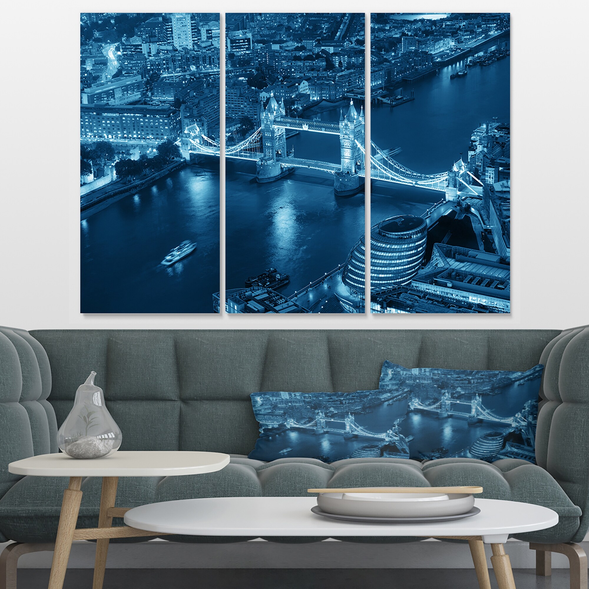 Designart "Blue London Night Aerial View" Cityscape Canvas Print - 36x28 - 3 Panels