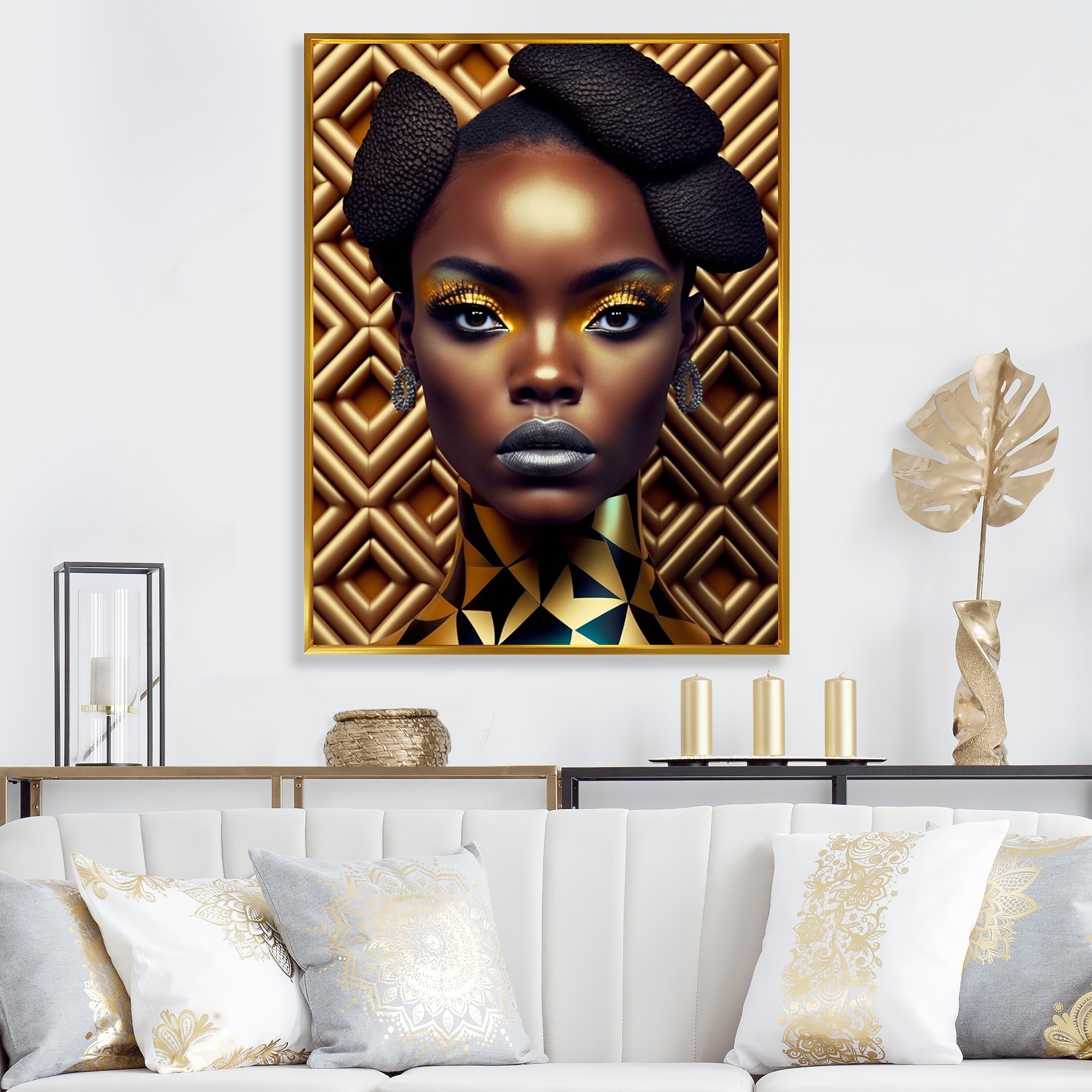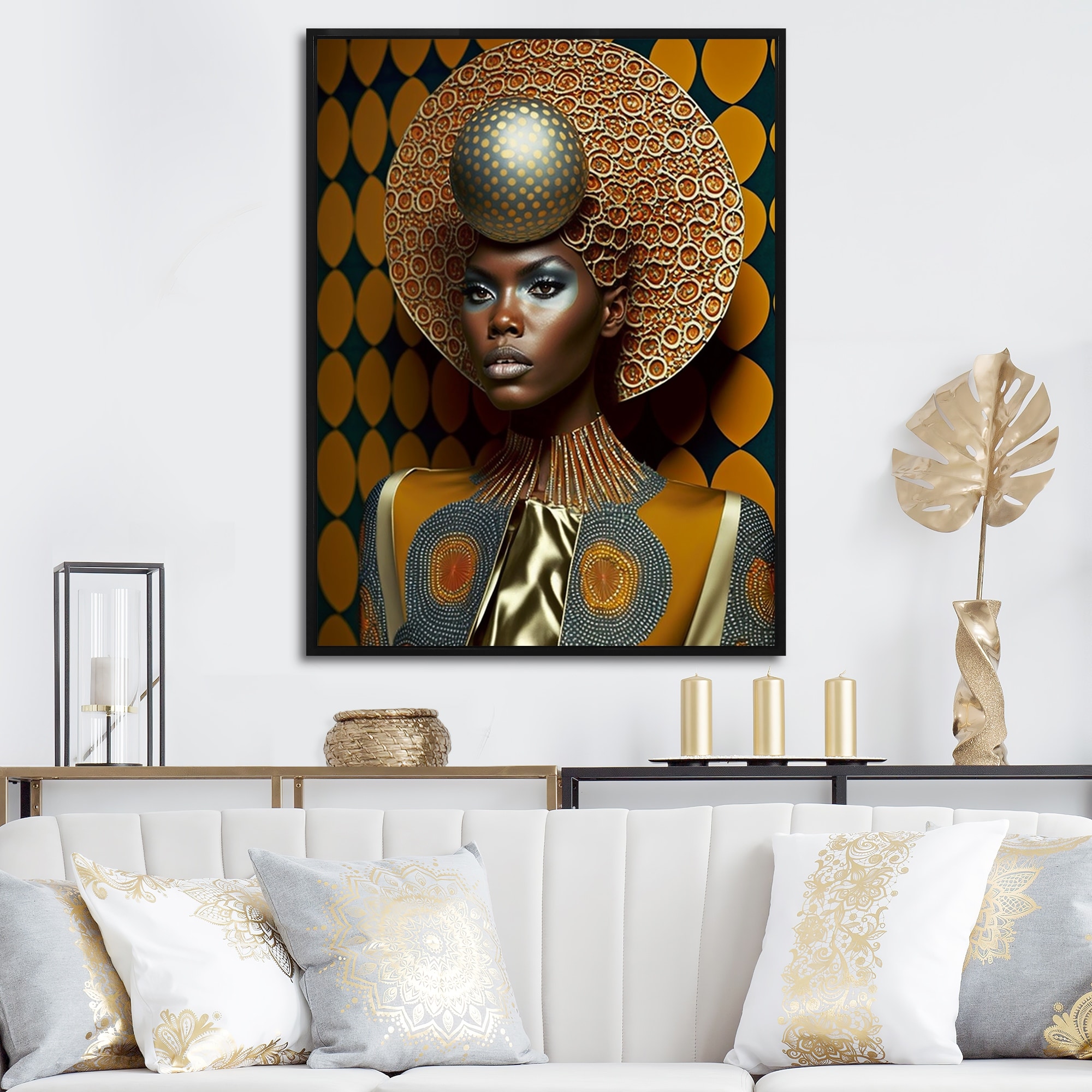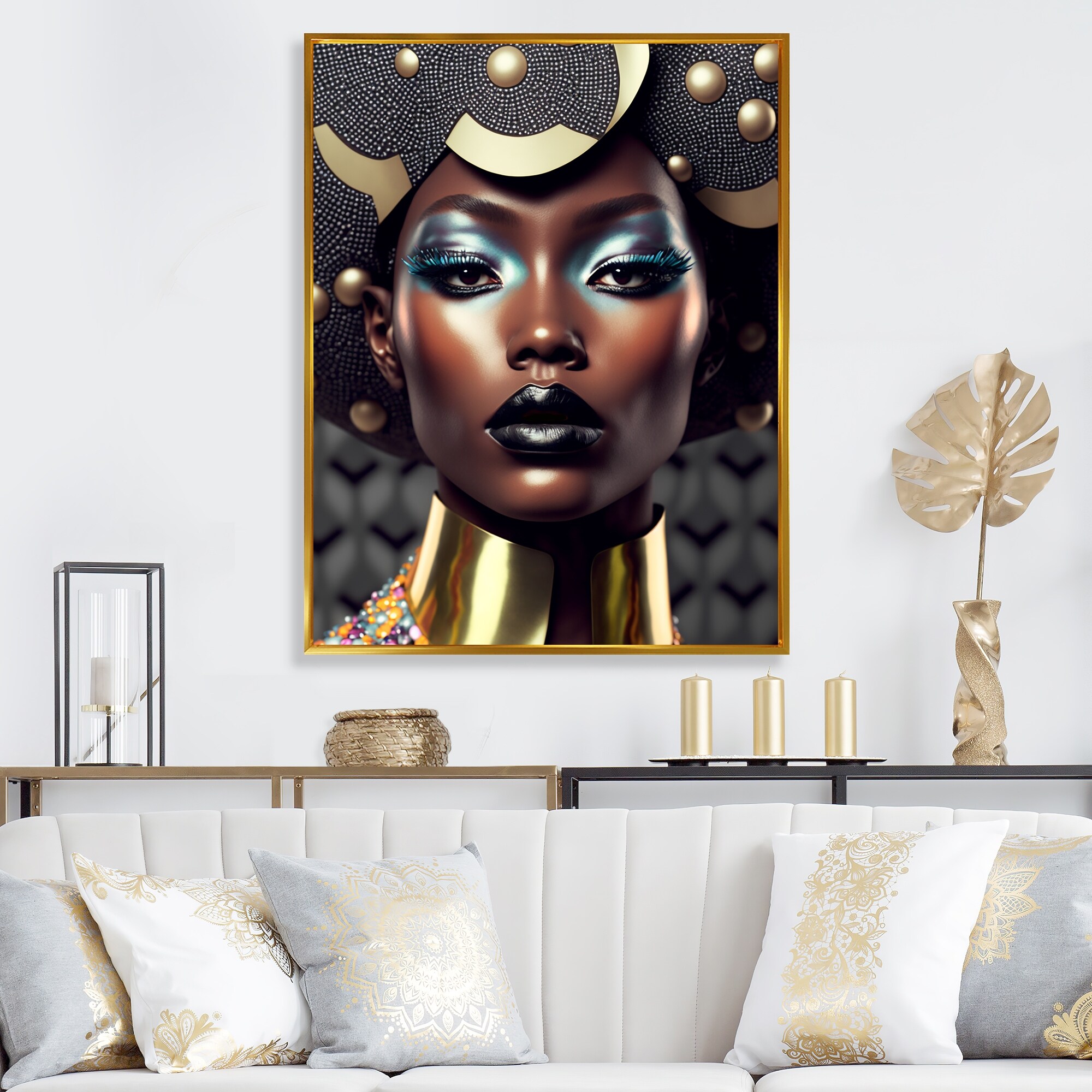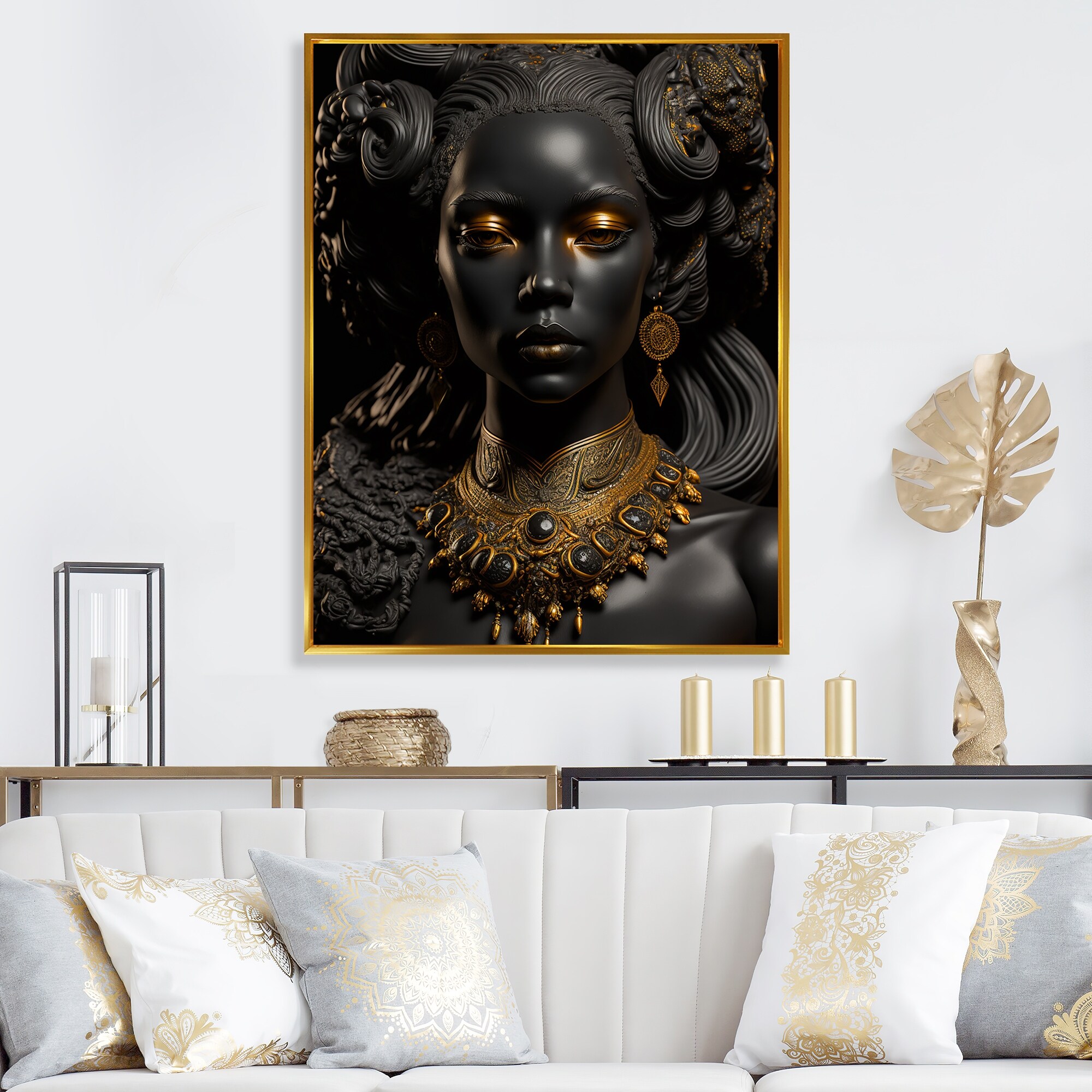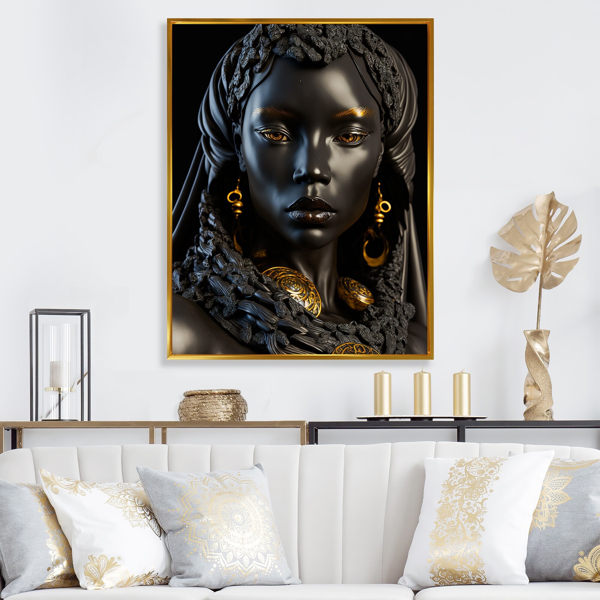 Designart "Close-Up Black And Gold African Goddess VIII" African American Woman Framed Canvas Wall Art