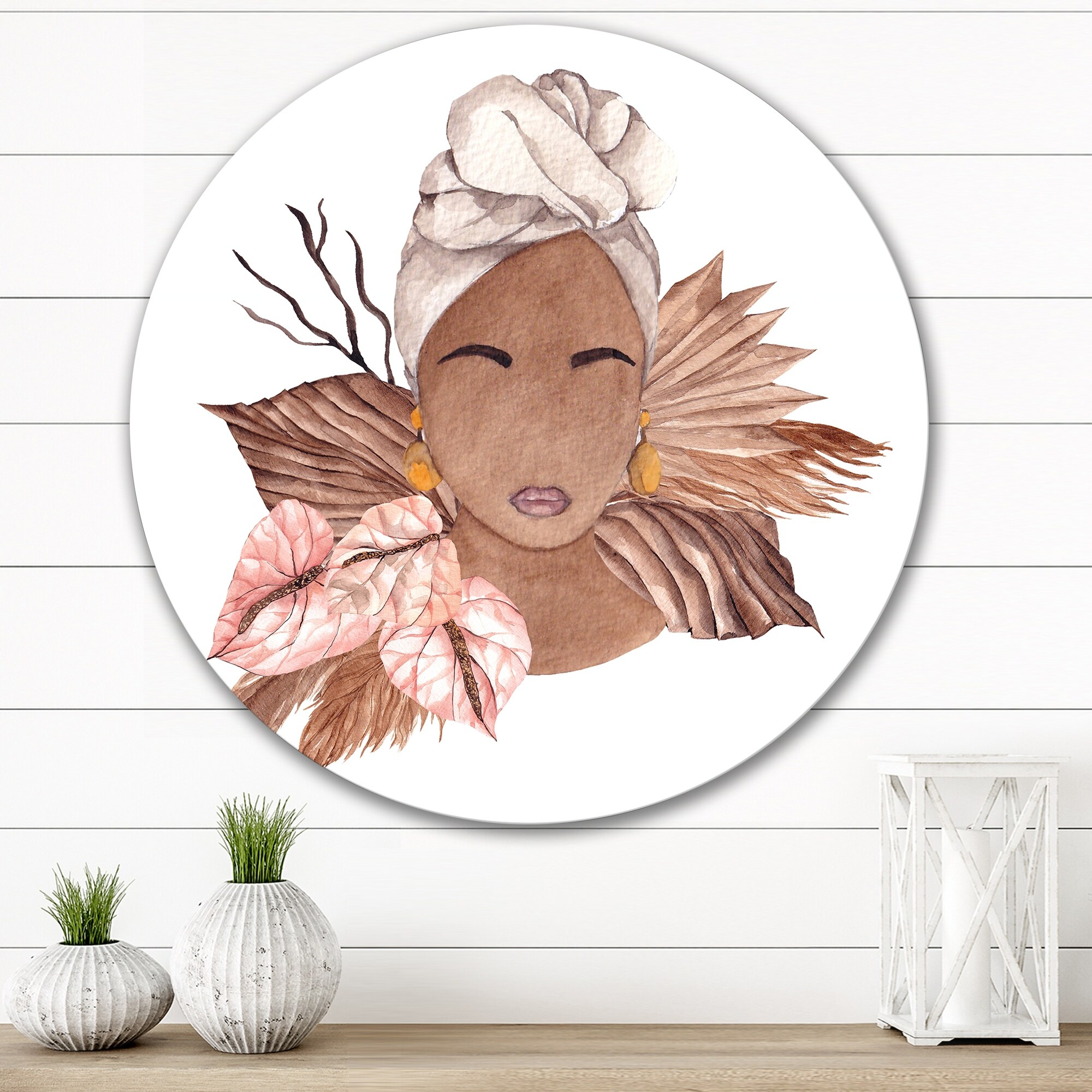 Designart 'African American Woman, Dried Flowers, Leaves I' Glam Metal Circle Wall Art