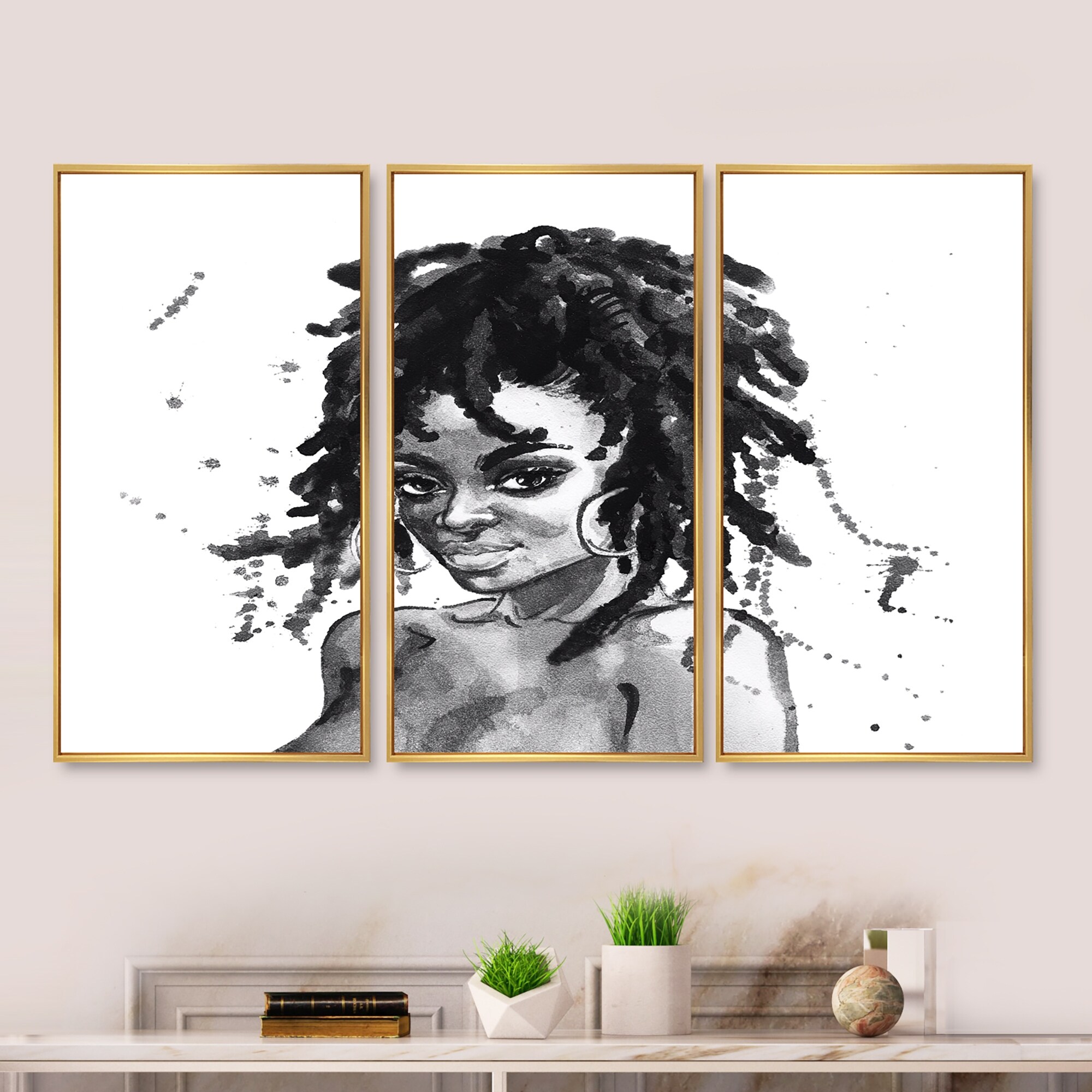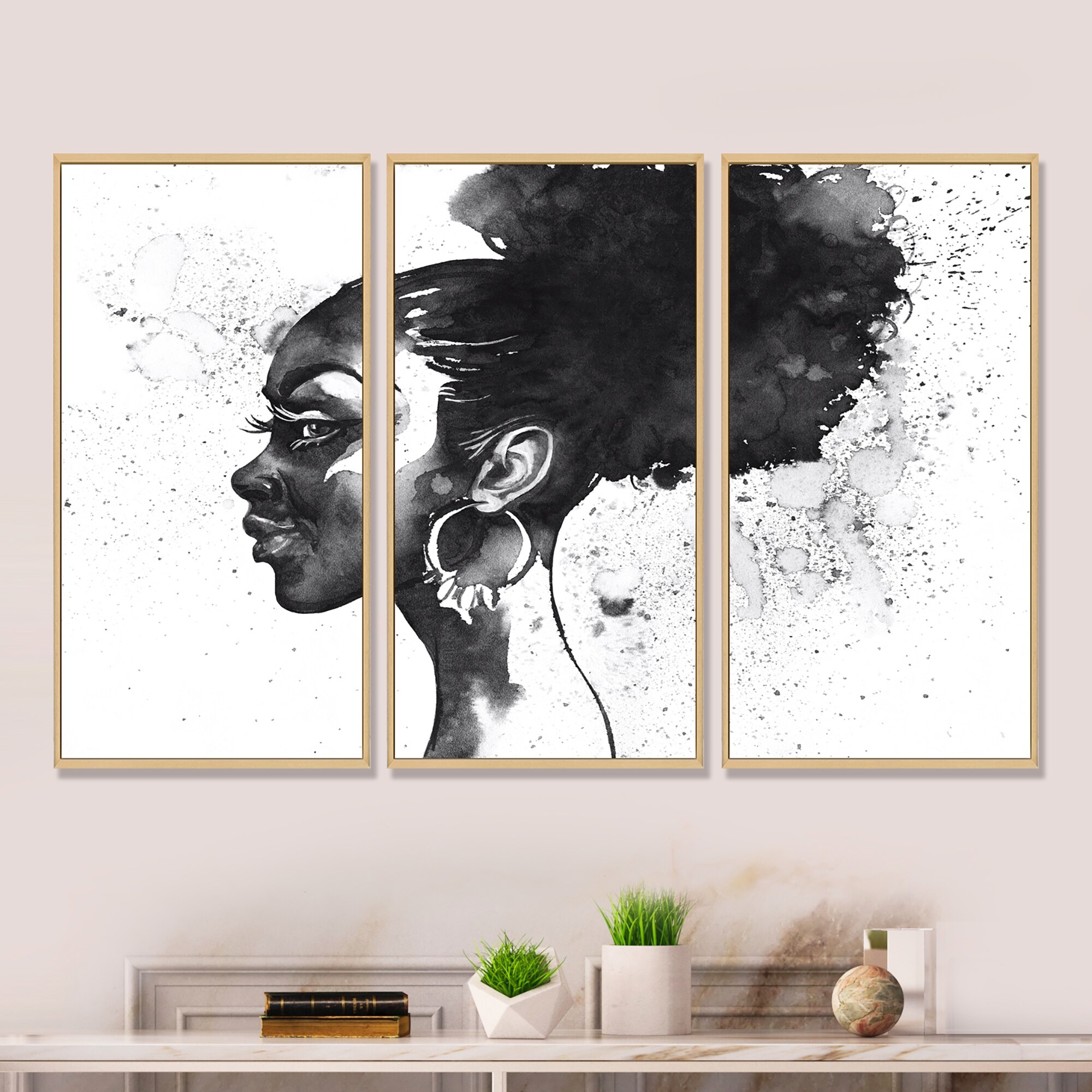 Designart "Contemporary Portrait of Young African American Woman IV" African American Framed Canvas Wall Art Print - 3 Panels
