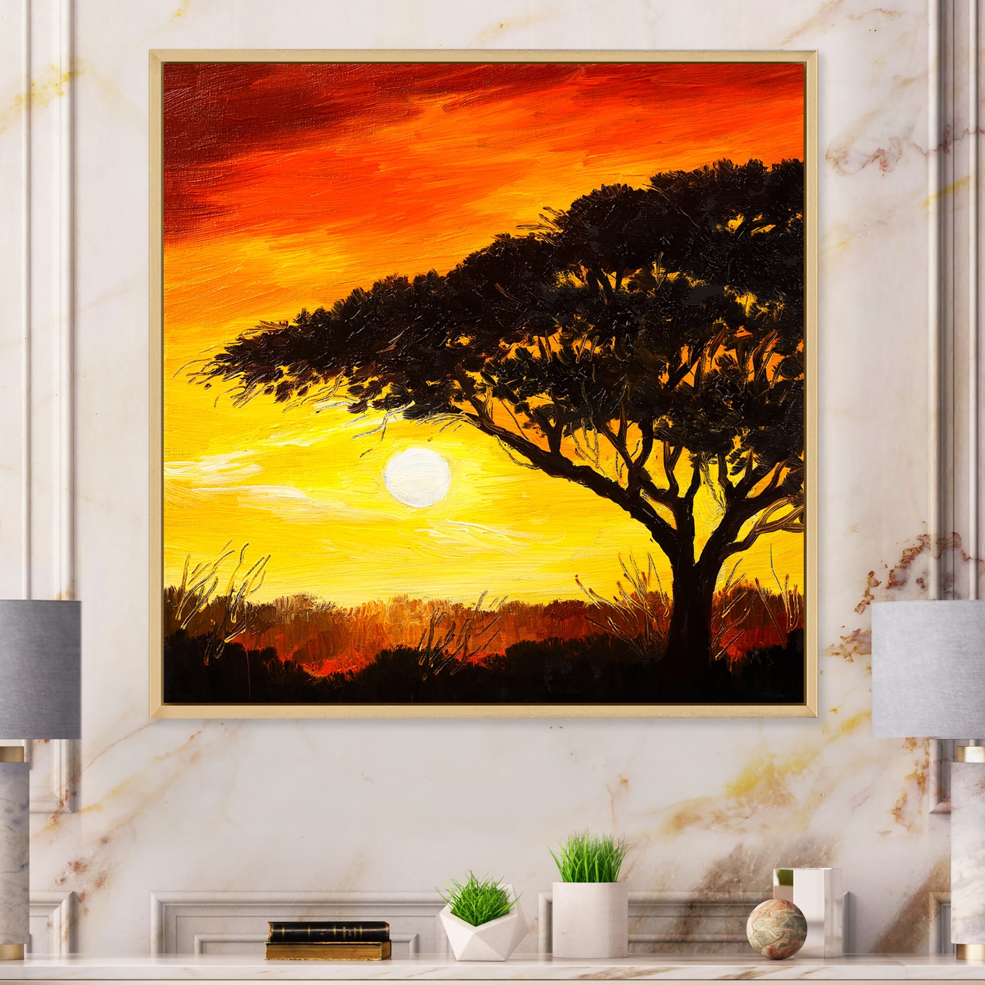 Designart "African Tree Under Wild Sunset" Traditional Framed Canvas Wall Art