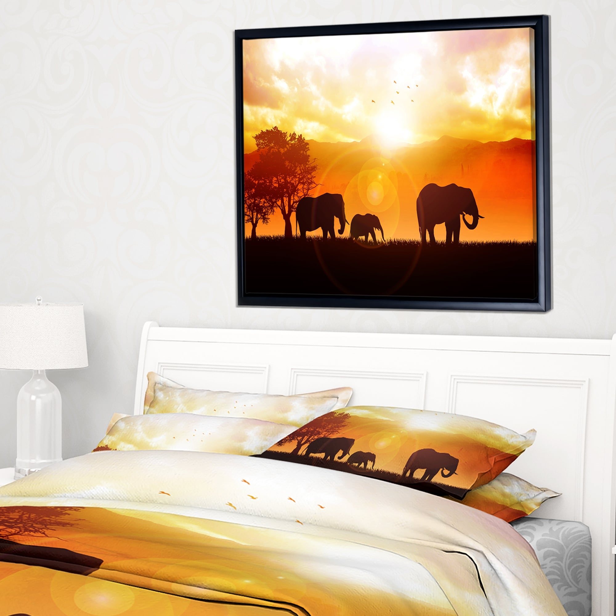 Designart "Elephants Walking At Sunset" African Framed Canvas Art Print