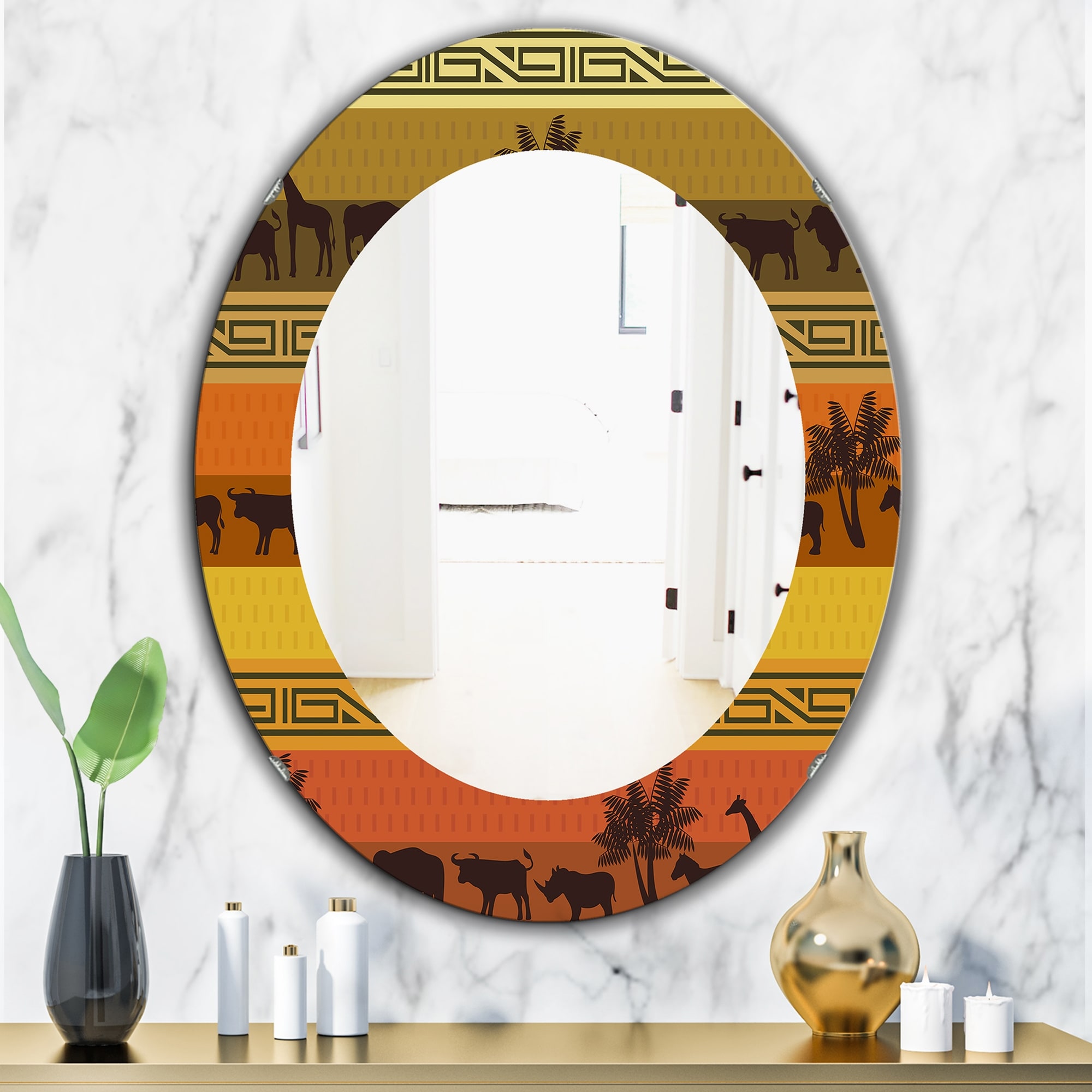 Designart 'African Wildlife' Printed Bohemian and Eclectic Frameless Oval or Round Wall Mirror - Orange