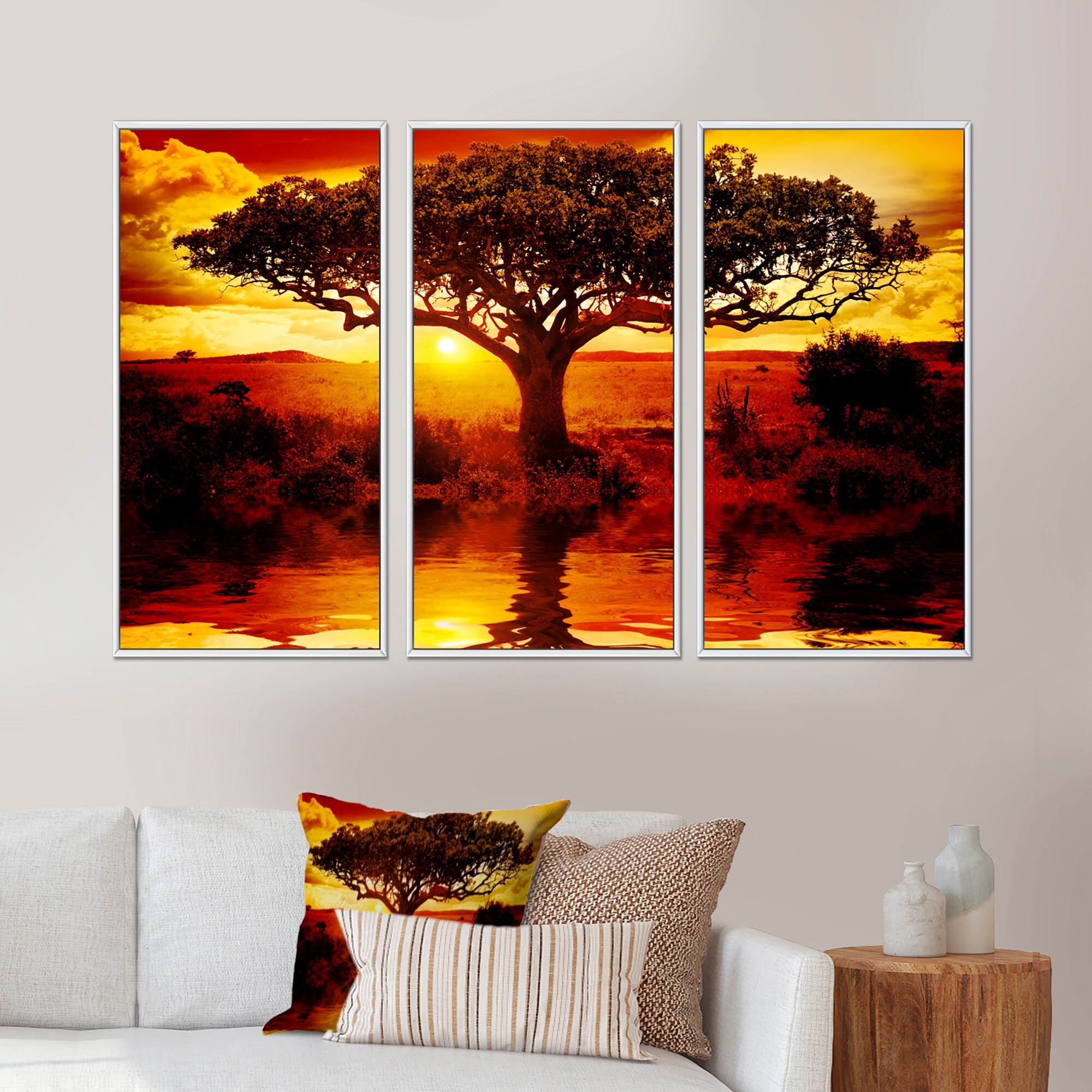 Designart "Lonely Tree in African Sunset" Landscape Framed Canvas Wall Art Set of 3 - 4 Colors of Frames