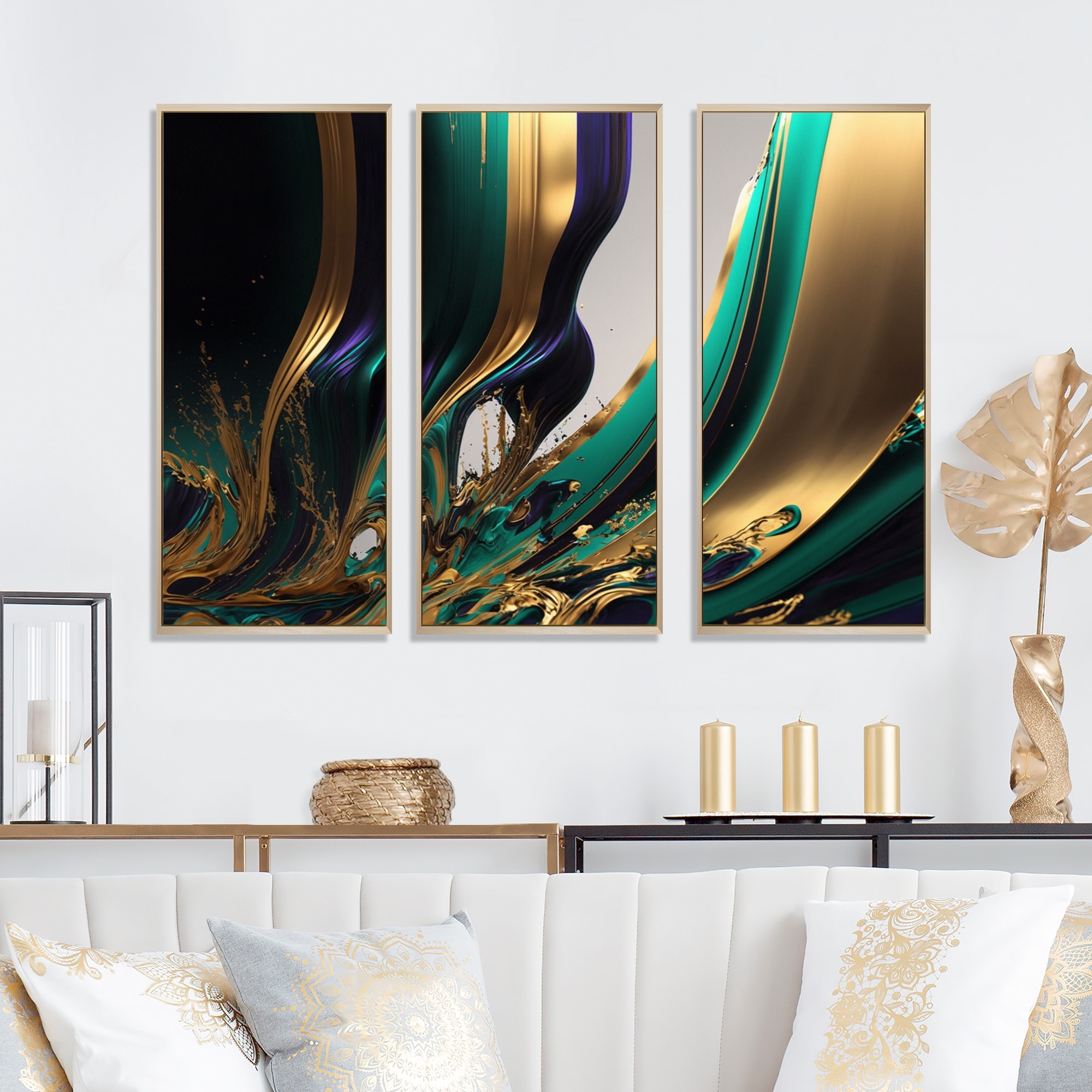 Designart "Green And Gold Agate III" Transitional Framed Canvas Art Print - 3 Panels